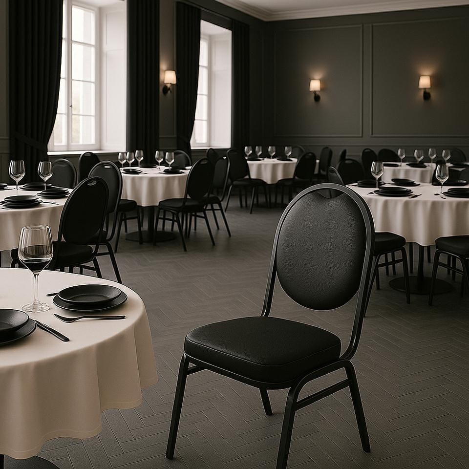 - Krzesło bankietowe / konferencyjne HEBE czarne. Uniwersalne krzesło konferencyjno-bankietowe o eleganckim, ponadczasowym wyglądzie. Tapicerowanie czarną ekoskórą nadaje mu profesjonalny charakter i jest łatwe do utrzymania w czystości. Stabilna stalowa ra