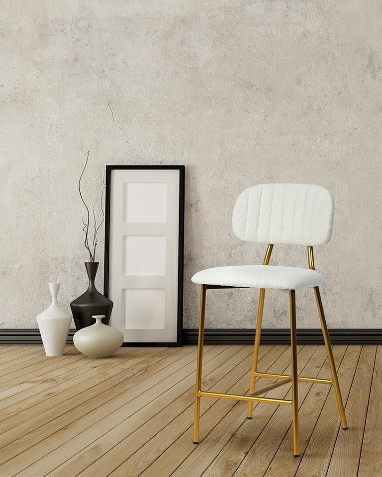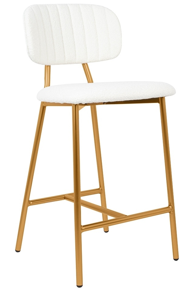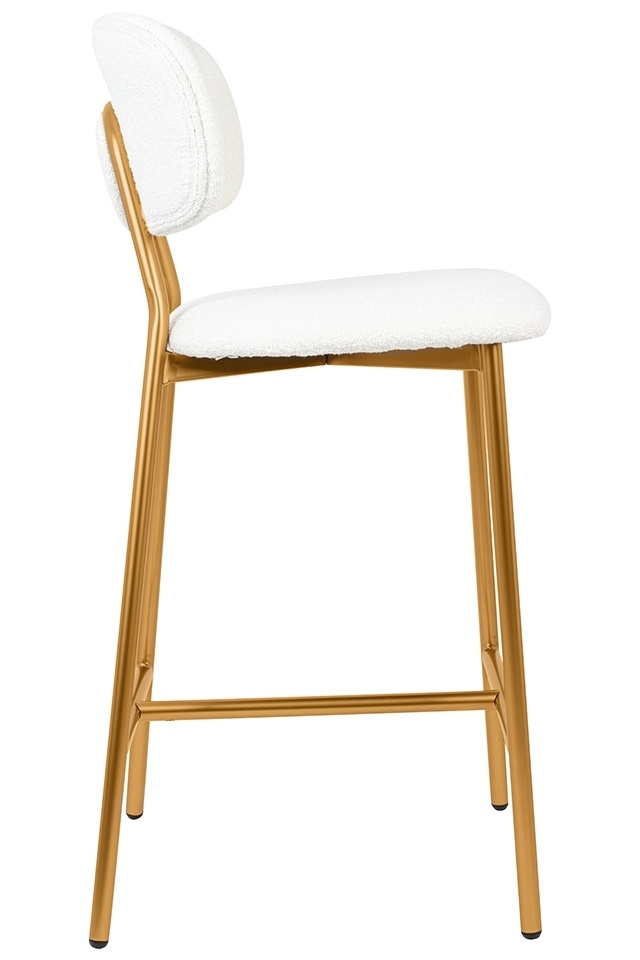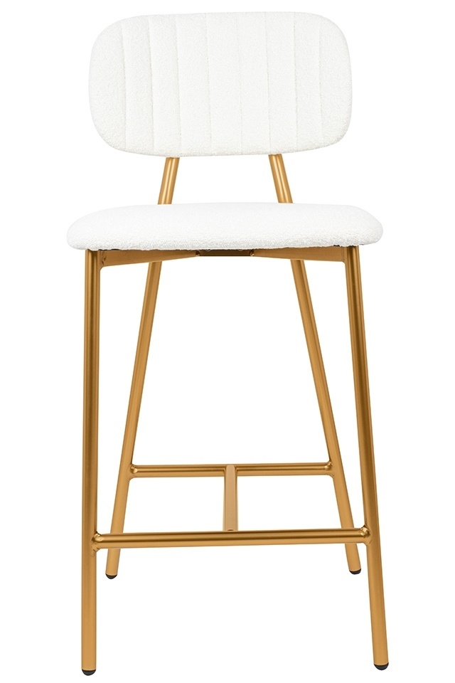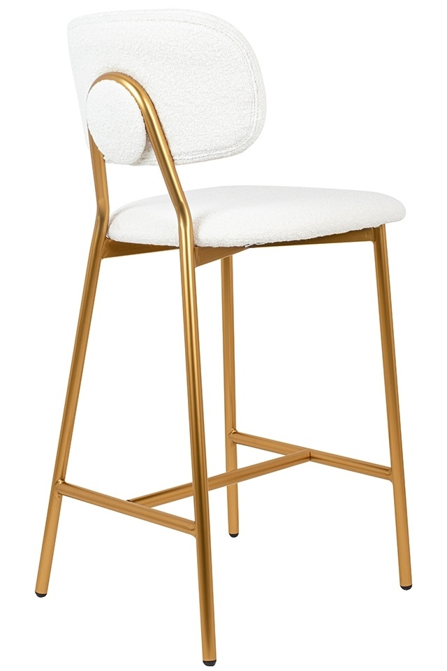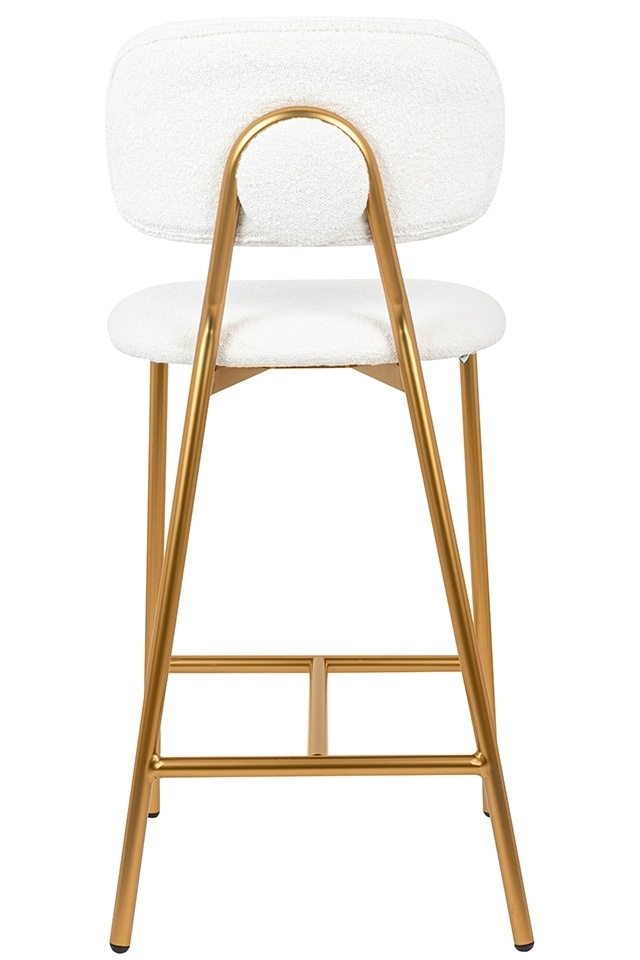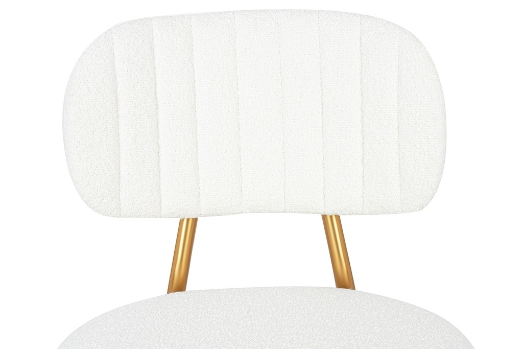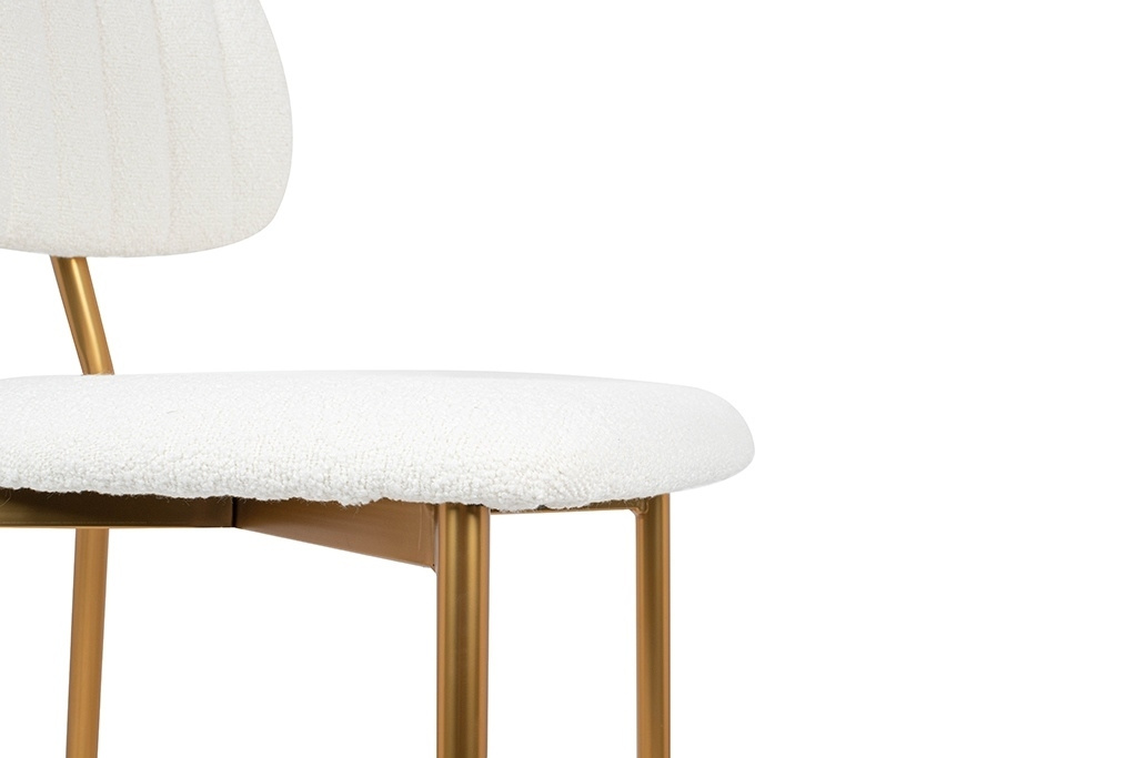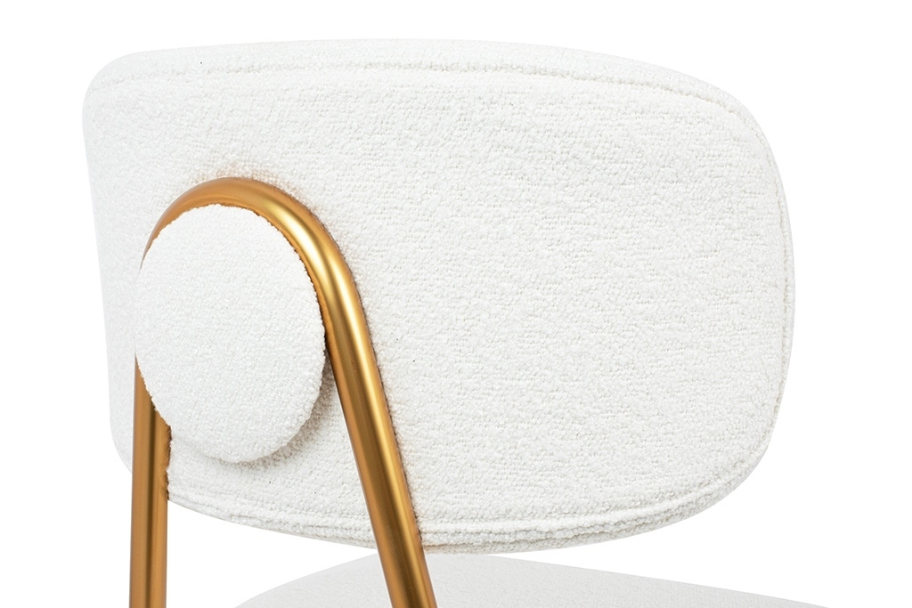 - Krzesło barowe FABIOLA BOUCLE białe. Oparcie i siedzisko tapicerowane są przyjemną, miękką w dotyku tkaniną boucle w kolorze białym. Podstawa została wykonana z metalu lakierowanego na kolor satynowego złota. Przeszycia na oparciu podkreślają nowoczesny c