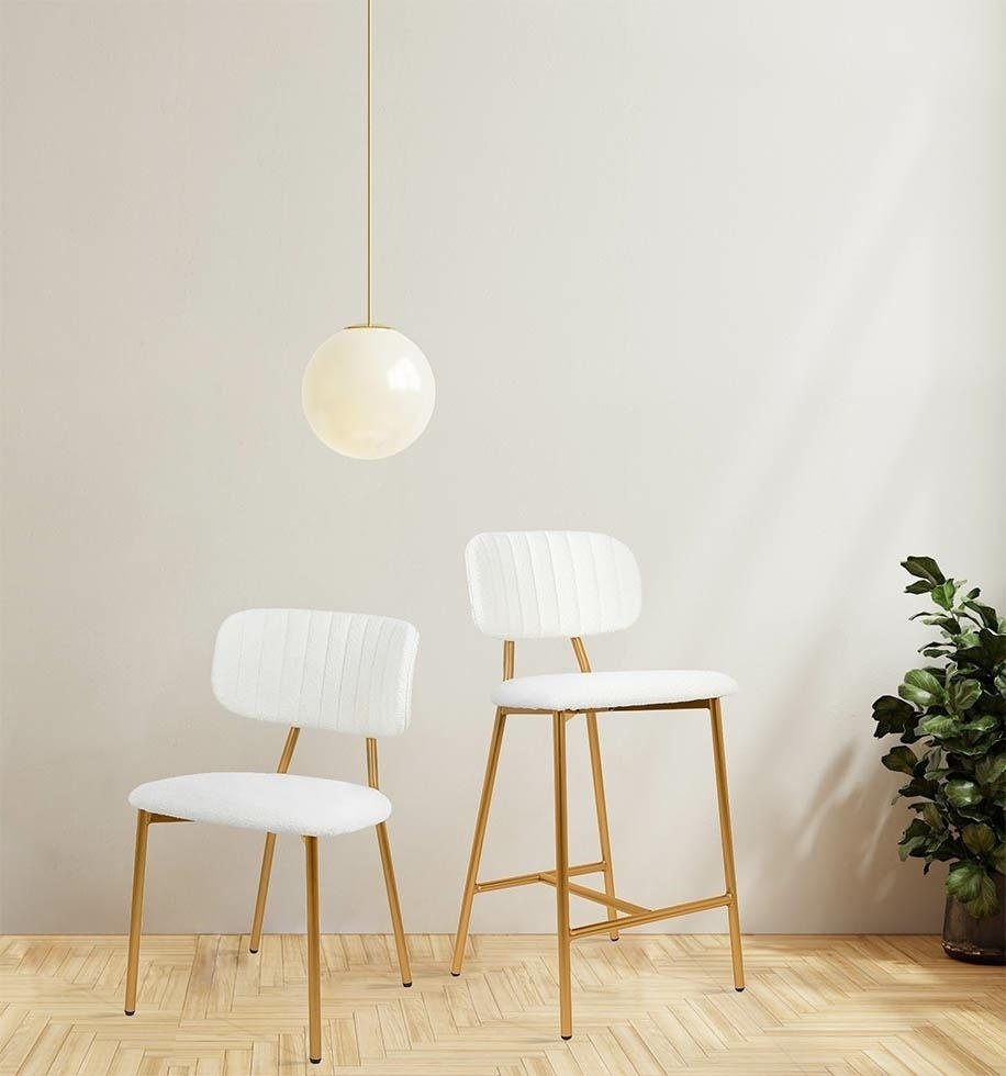 Krzesło barowe FABIOLA BOUCLE białe. Oparcie i siedzisko tapicerowane są przyjemną, miękką w dotyku tkaniną boucle w kolorze białym. Podstawa została wykonana z metalu lakierowanego na kolor satynowego złota. Przeszycia na oparciu podkreślają nowoczesny charakter krzesła, a struktura materiału uczyni wnętrze szykownym i przytulnym. Wymiary: wys. 94,5 cm / szer. 45 cm / gł. 51 cm Wysokość do krawędzi siedziska: 64 cm Siedzisko: szer. 45 cm / gł. 41 cm Oparcie: wys. 33 cm / szer. 40 cm Rozstaw nóg: szer. 45 cm / gł. 45 cm Wysokość do podnóżka: 19 cm Waga netto: 6,8 kg Wymiary opakowania: 98,5 cm / 47 cm / 35 cm.Cechy produktu