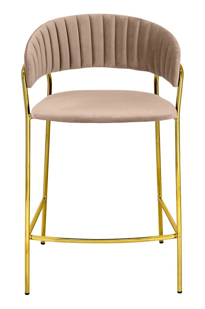 Krzesło barowe MARGO w kolorze khaki. Siedzisko i oparcie tapicerowane miękkim i przyjemnym w dotyku welurem. Mocna i stabilna konstrukcja wykonana została z metalu w kolorze złotym, błyszczącym. Doskonałe połączenie modnej tkaniny i złota. Pionowe przeszycia na oparciu dodają elegancji. Margo idealnie odnajdzie się we wnętrzach nowoczesnych i klasycznych. Wymiary: wys. 89 cm / szer. 53,5 cm / gł. 52 cm Wysokość do krawędzi siedziska: 65 cm Siedzisko: szer. 47 cm / gł. 43 cm Rozstaw nóg: szer. 53,5 cm / gł. 54 cm Waga netto: 6 kg Wymiary opakowania: 105 cm / 54 cm / 64,5 cm.Cechy produktu
