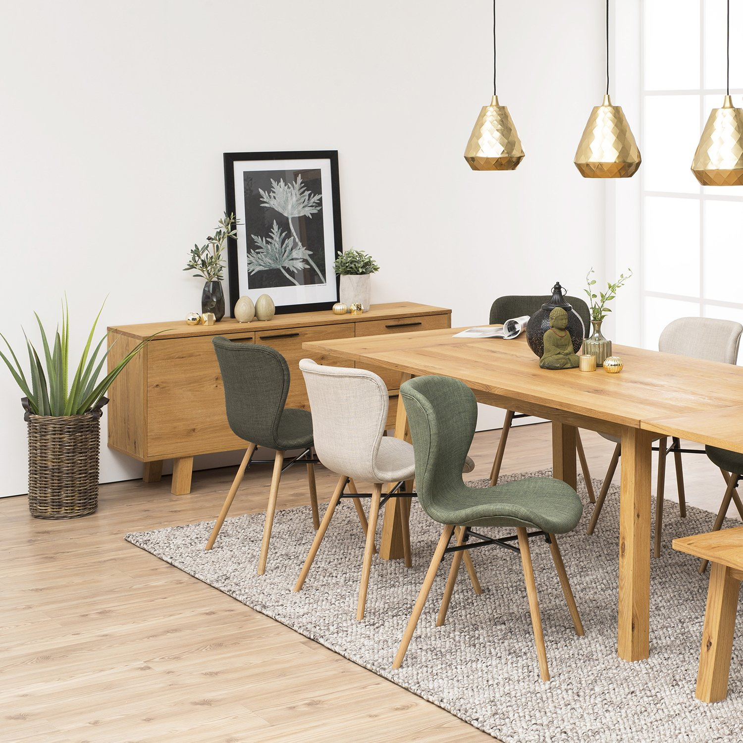 - Krzesło Batilda to doskonałe rozwiązanie do salonu czy jadalni. Solidna podstawa wykonana z drewna dębowego, wzmocniona metalowym krzyżakiem zapewni stabilność podczas użytkowania. Siedzisko z tkaniny bawełnianej o gęstym splocie dodatkowo z grubszym obsz