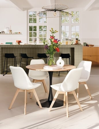 Modne krzesło jadalniane Baya opiera się na prostocie. Dzięki niemu Twoja jadalnia zyska ponadczasowy, ciepły charakter. Dla dodatkowego komfortu, muszla siedziska została ozdobiona poduszką, idealną do spędzania czasu przy stole. Do samodzielnego montażu: Tak Zastosowanie: Wnętrza Gęstość tapicerki: 24 kg/m3 Sztaplowane: Nie Podkładki pod nogi w zestawie: Tak Materiał tapicerki: Pianka poliuretanowa (PU) Głębokość siedziska: 39 cm Długość siedziska: 48 cm Wysokość siedziska: 47 cm Pianka wysokoelastyczna: Nie Materiał powłoki: Poliester Materiał konstrukcji: Polipropylen Materiał nóg: Buk Wymiary: Szer. 48,5 x Gł. 56 x Wys. 82 cmCechy produktu