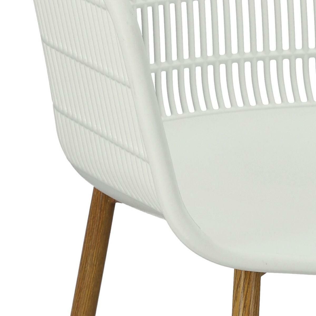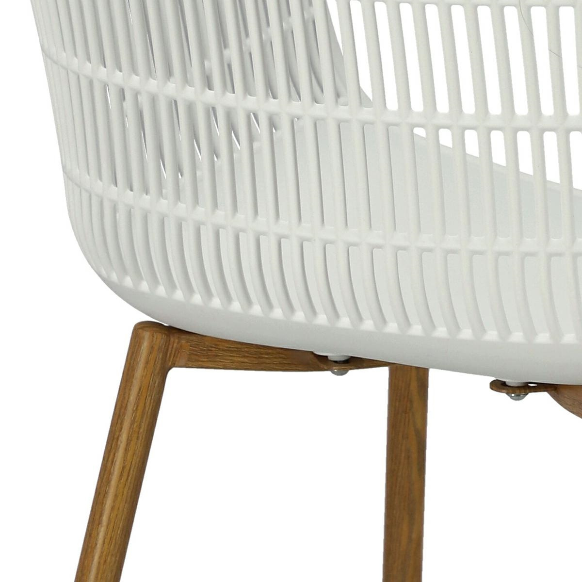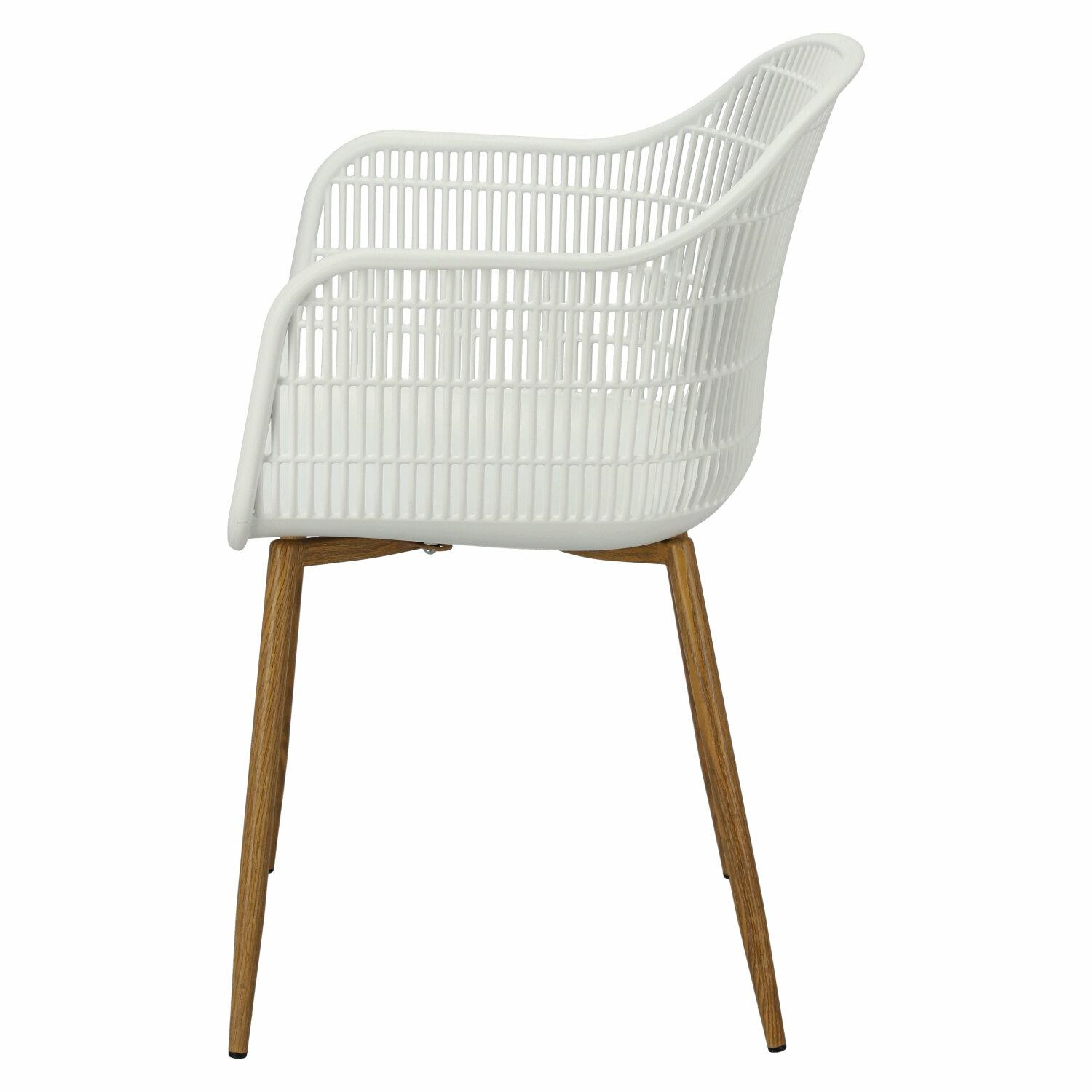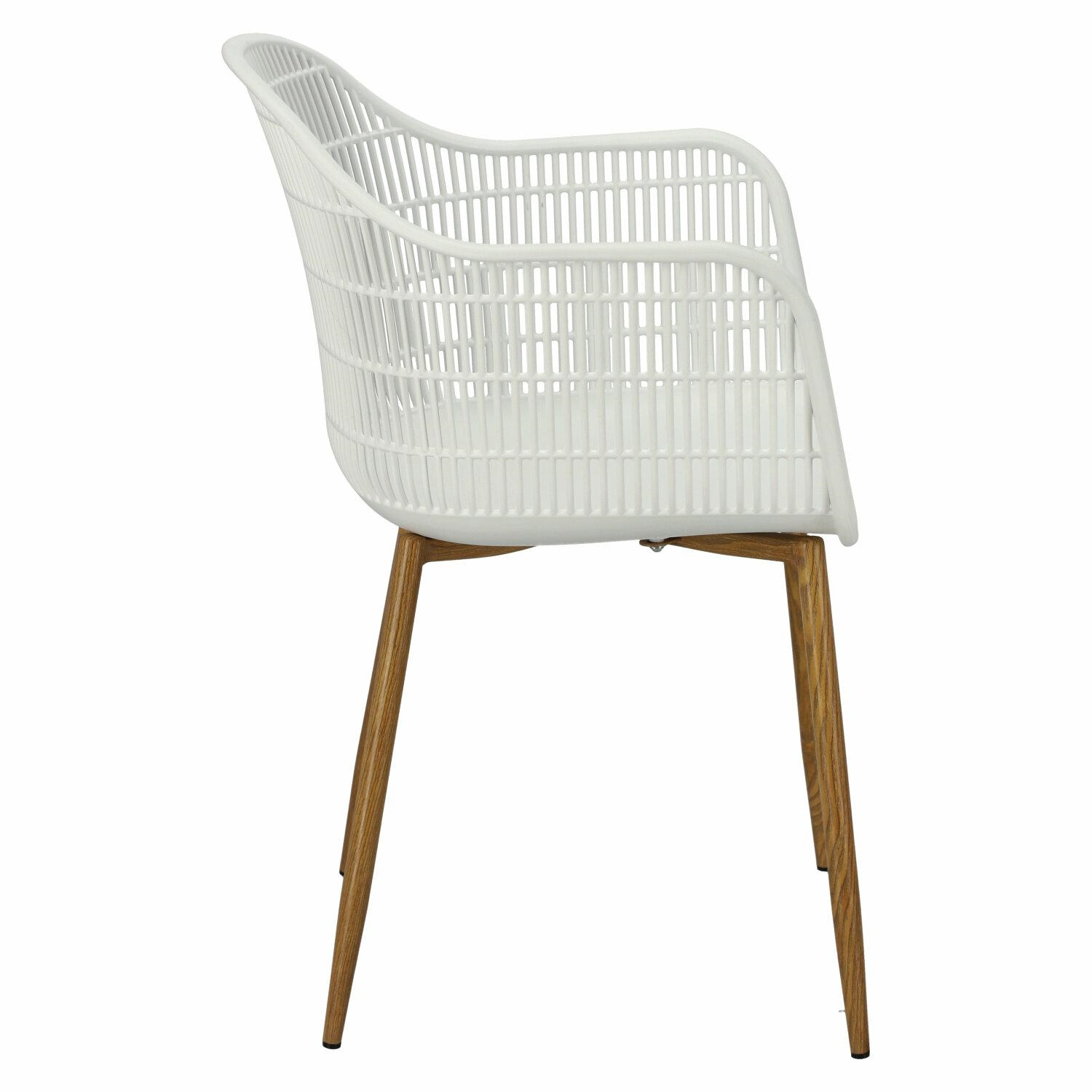 Nowoczesne krzesło Becker zostało wykonane z wytrzymałego tworzywa w kolorze białym. Polipropylen użyty w siedzisku posiada matowe wykończenie, jest łatwy w czyszczeniu i odporny na zabrudzenia, ponadto cechuje się również wytrzymałością. Charakterystyczne siedzisko, podłokietniki i oparcie przypominają siatkę. Podstawa krzesła wykonana została z metalu pokrytego okleiną o strukurze drewna. Okleina użyta w podstawie posiada półmatowe wykończenie. Maksymalne obciążenie krzesła wynosi 120kg. wysokość podłokietników od siedziska 27 cm głębokość siedziska 45 cm szerokość siedziska 48 cm WymiCechy produktu