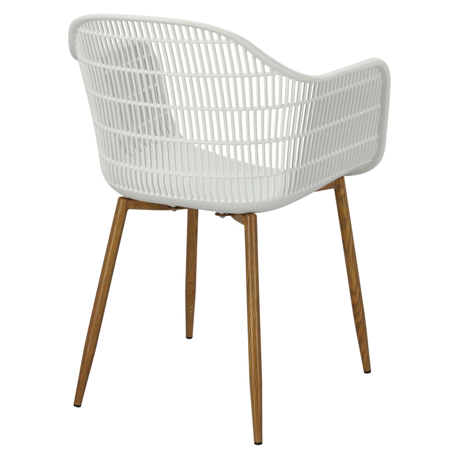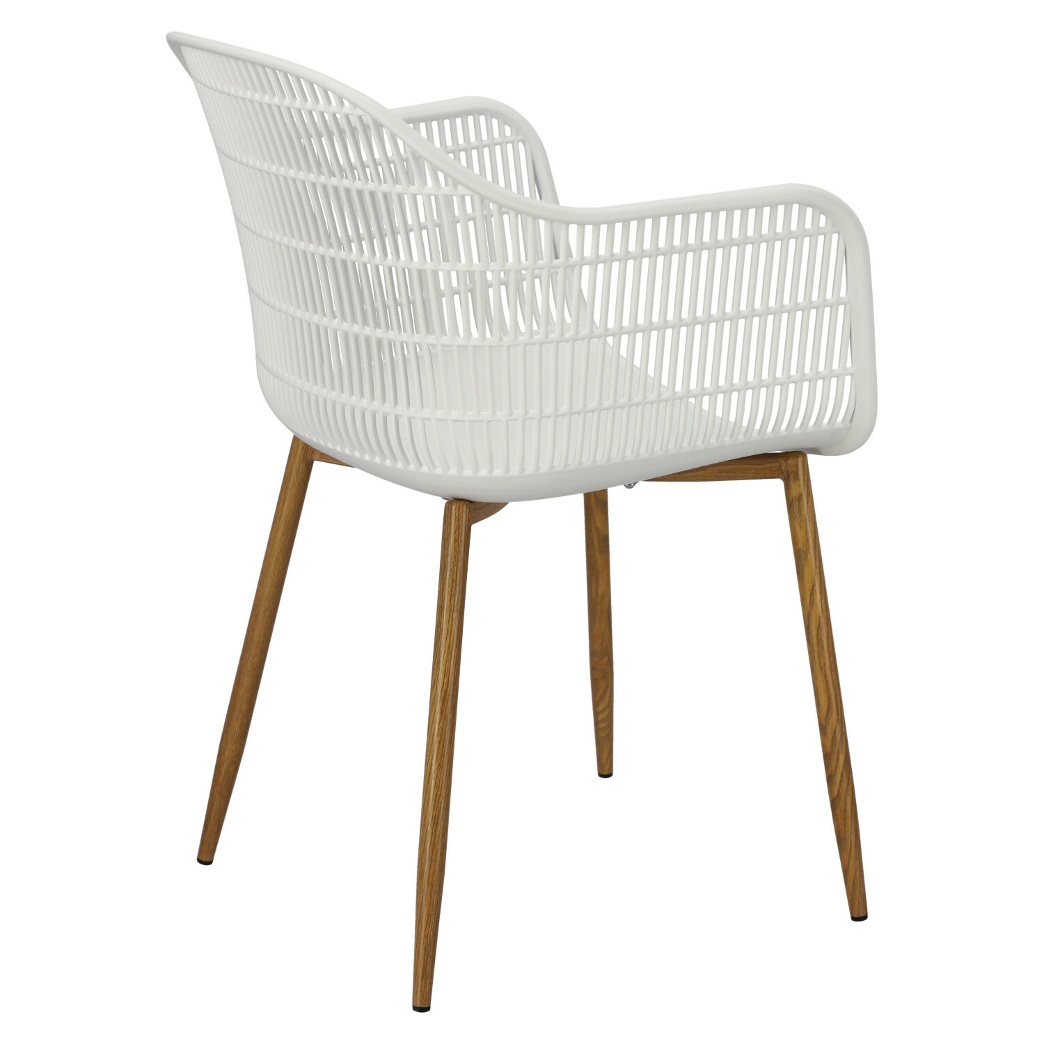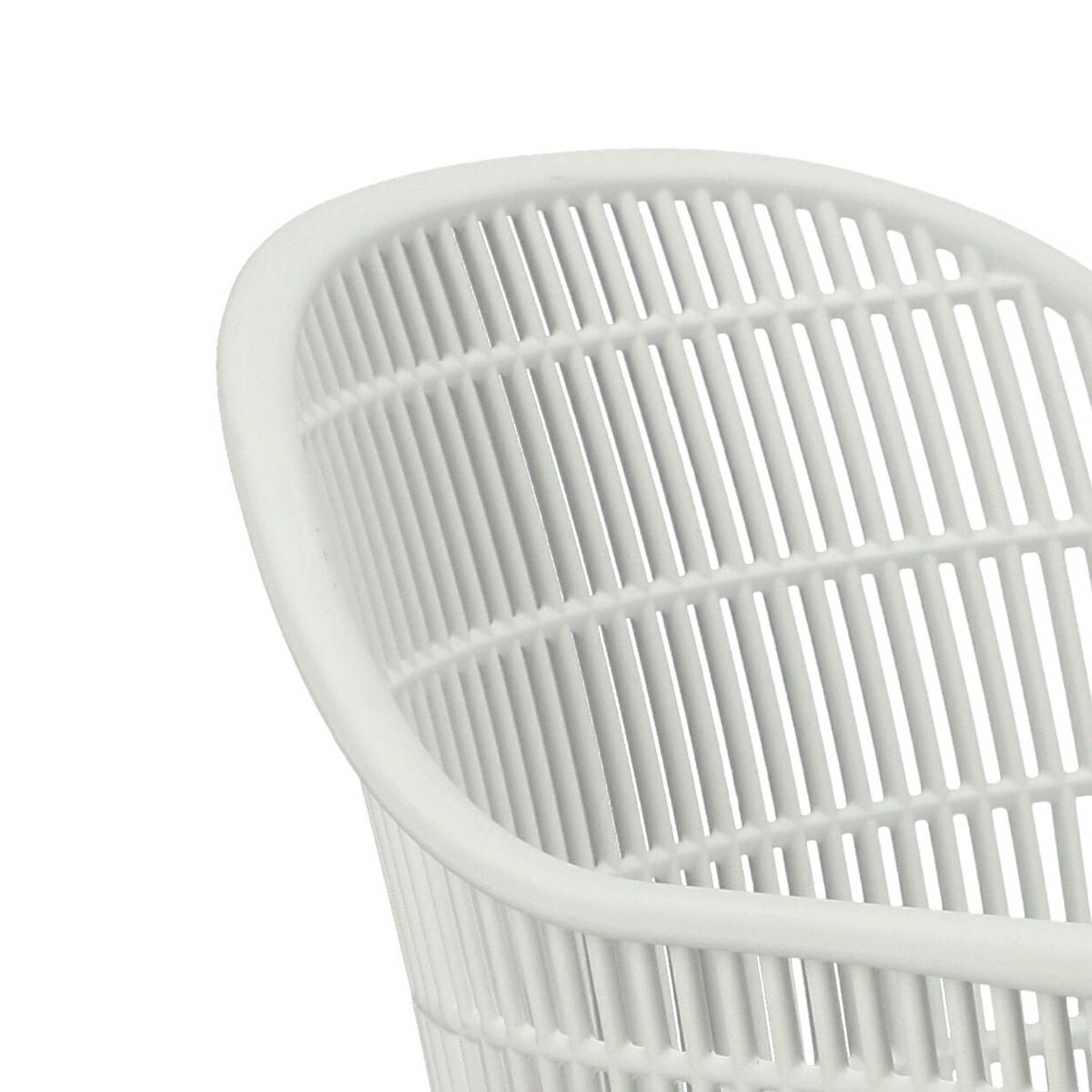 Nowoczesne krzesło Becker zostało wykonane z wytrzymałego tworzywa w kolorze białym. Polipropylen użyty w siedzisku posiada matowe wykończenie, jest łatwy w czyszczeniu i odporny na zabrudzenia, ponadto cechuje się również wytrzymałością. Charakterystyczne siedzisko, podłokietniki i oparcie przypominają siatkę. Podstawa krzesła wykonana została z metalu pokrytego okleiną o strukurze drewna. Okleina użyta w podstawie posiada półmatowe wykończenie. Maksymalne obciążenie krzesła wynosi 120kg. wysokość podłokietników od siedziska 27 cm głębokość siedziska 45 cm szerokość siedziska 48 cm WymiCechy produktu