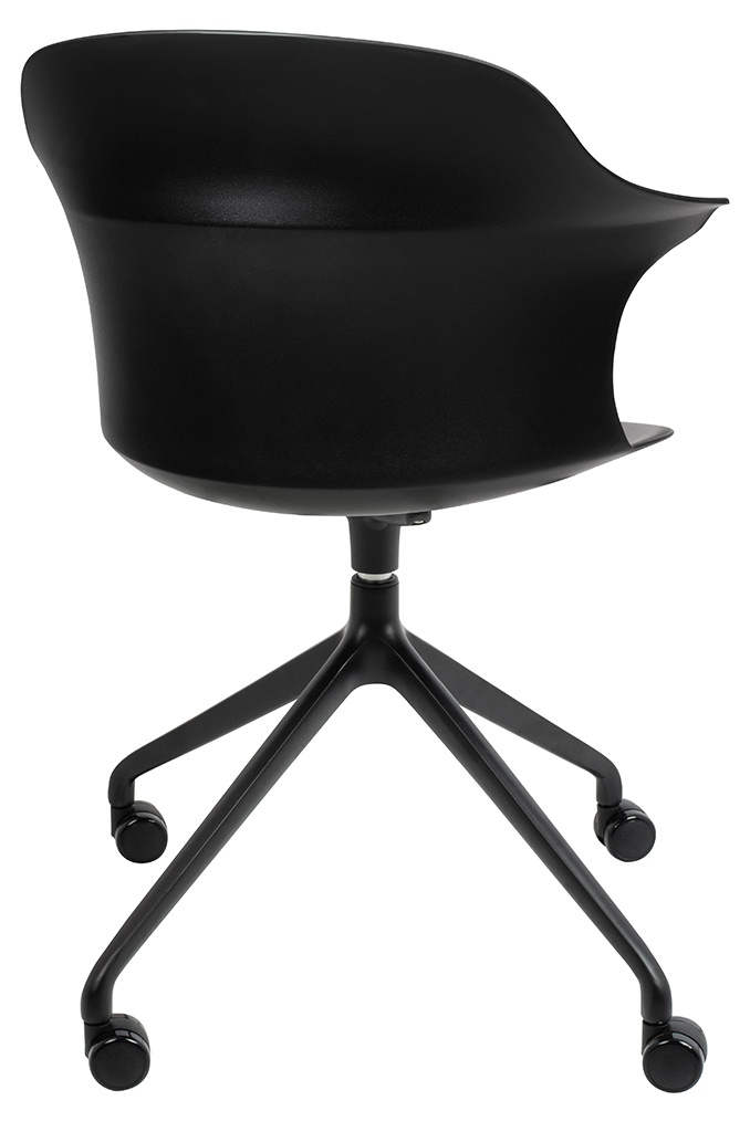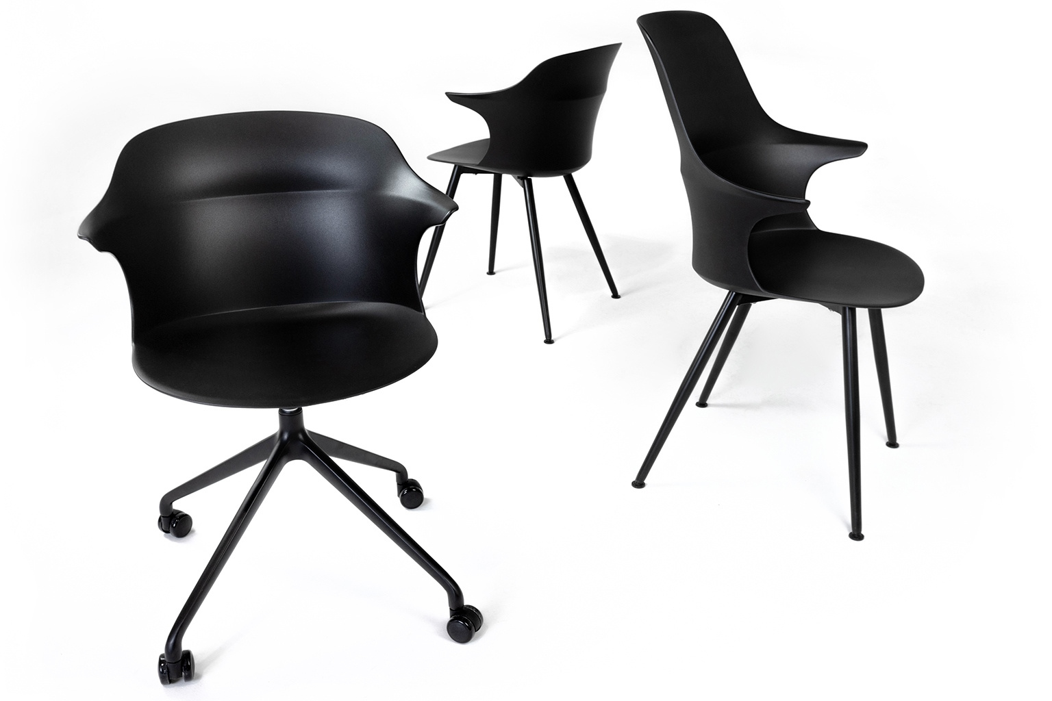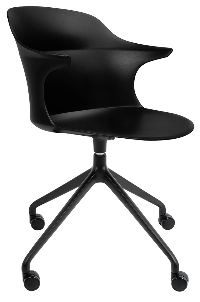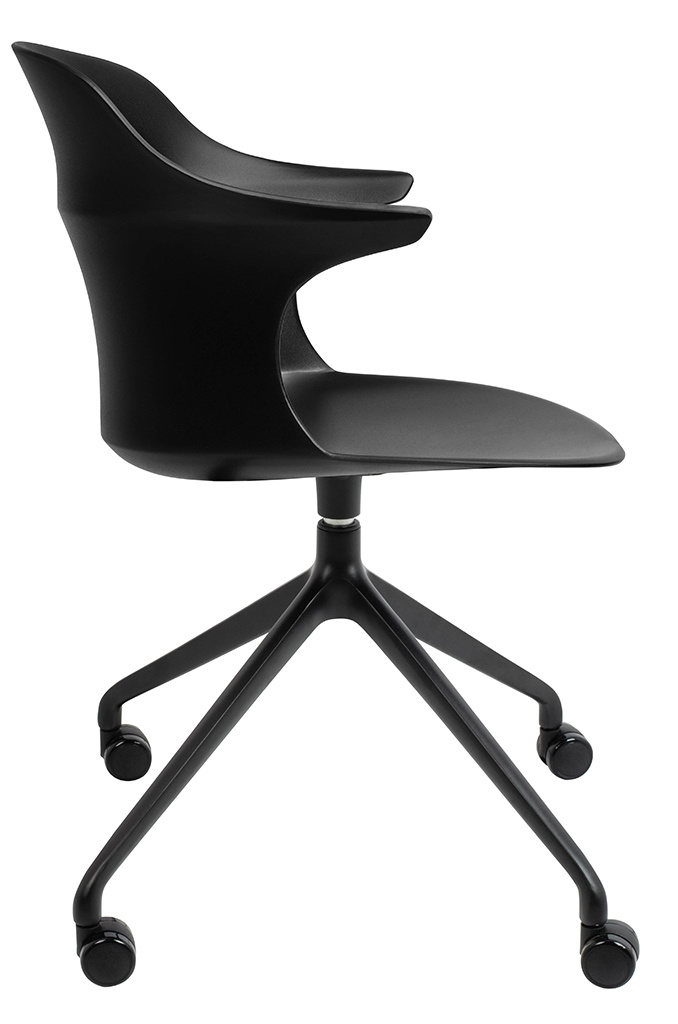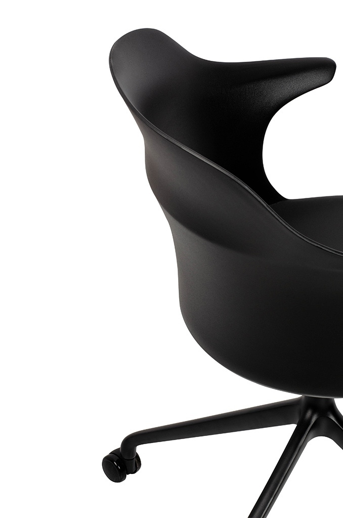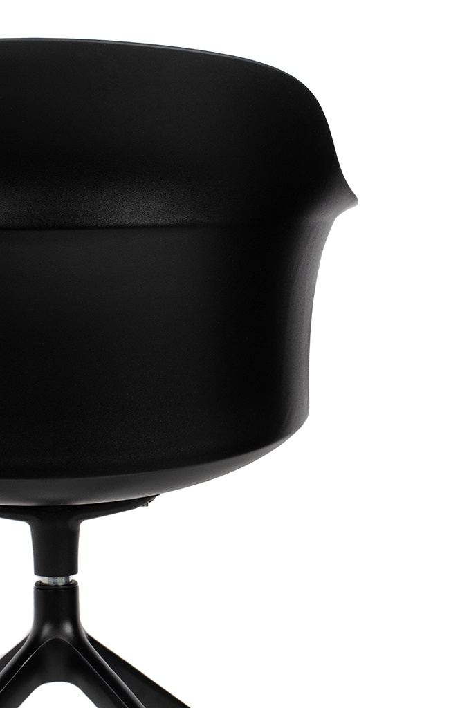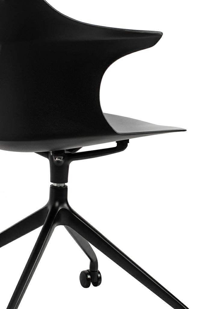 - Krzesło biurowe obrotowe BRAZO to produkt, który swoją nietypową formą z pewnością trafi w niebanalne gusta. Profilowane siedzisko zostało wykonane z wytrzymałego polipropylenu w kolorze czarnym. Nietypowe załamanie na oparciu przy podłokietnikach dodaje