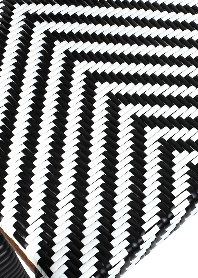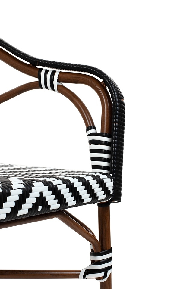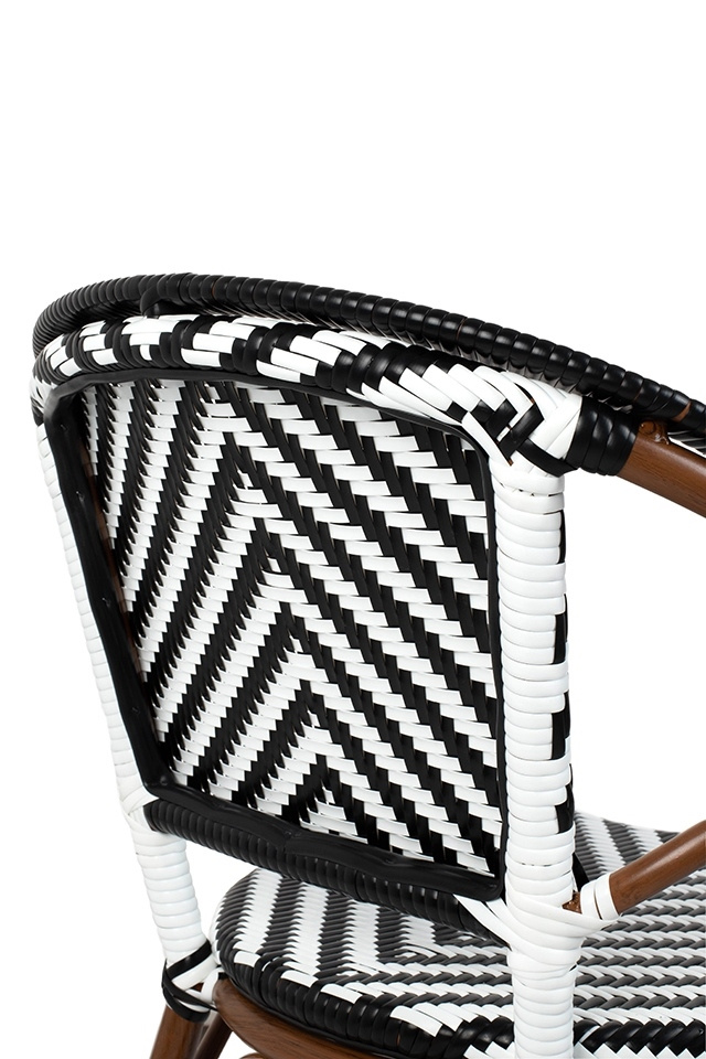 Krzesło CAFE AZURE biały / czarny. Ponadczasowe, lekkie krzesło, które uzupełni zarówno Twoje wnętrze, jak i ogród. Zainspirowane stylem paryskich kawiarni, które budzą zachwyt na całym świecie. Może być stosowane do użytku wewnętrznego oraz zewnętrznego. Wykonane w całości z aluminium z efektem drewna orzechowego. Wygodne siedzisko wraz z podłokietnikami wykonano z wikliny syntetycznej i wykończono w eleganckiej kolorystyce biało-czarnej, która jest odporna na promieniowanie UV. Dużym atutem jest możliwość sztaplowania, dzięki czemu będzie produktem praktycznym do ogródka czy restauracji. Dostępne różne wersje kolorystyczne oraz stolik z kolekcji. Wymiary: wys. 83 cm / szer. 60 cm / gł. 62 cm Wysokość do krawędzi siedziska: 45 cm Siedzisko: szer. 47 cm / gł. 45 cm Oparcie: wys. 42 cm / szer. 40 cm Wysokość do podłokietników: 67 cm Rozstaw nóg: przód szer. 58 cm / tył szer. 45 cm / gł. 49 cm.Cechy produktu
