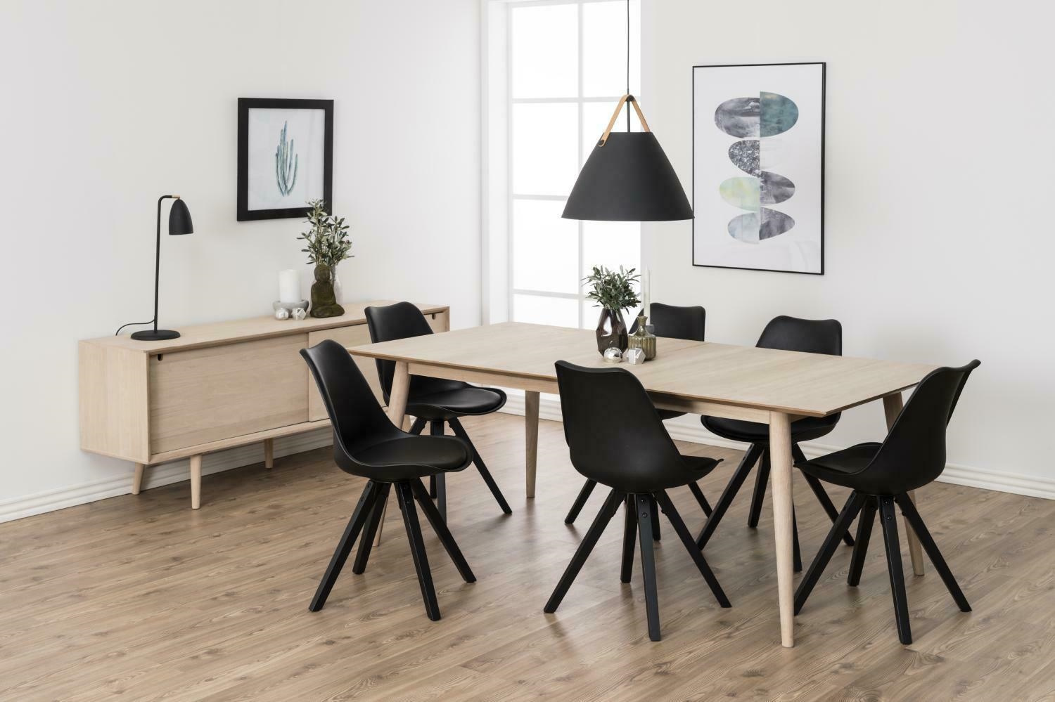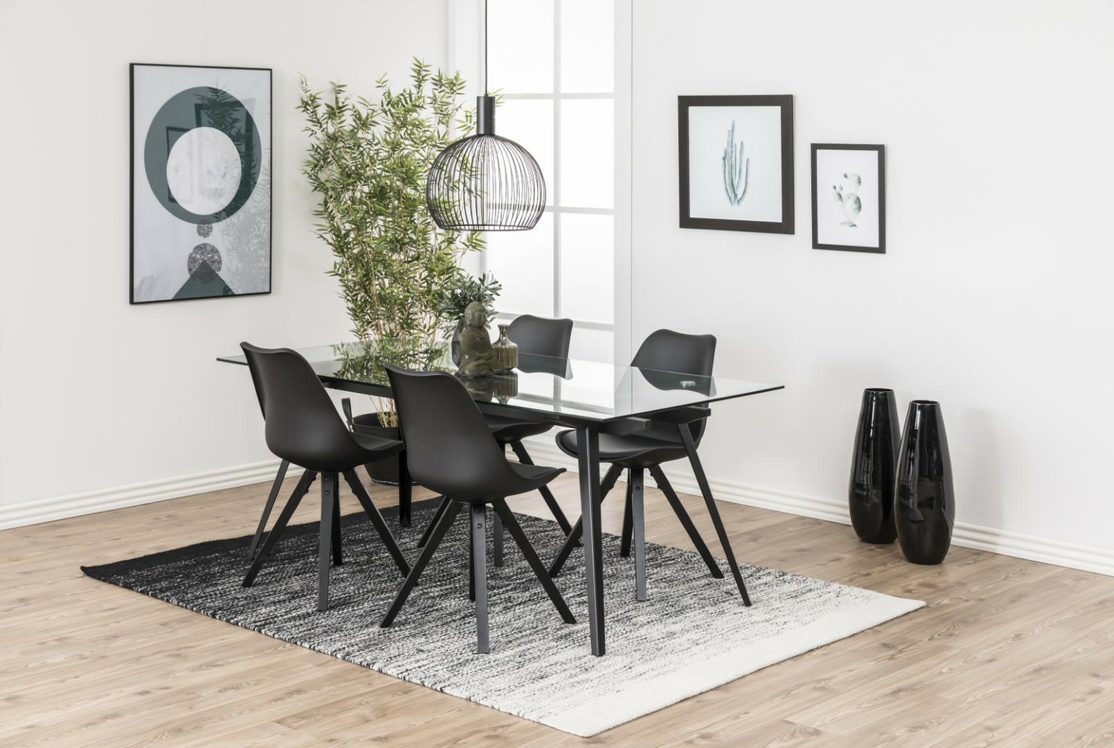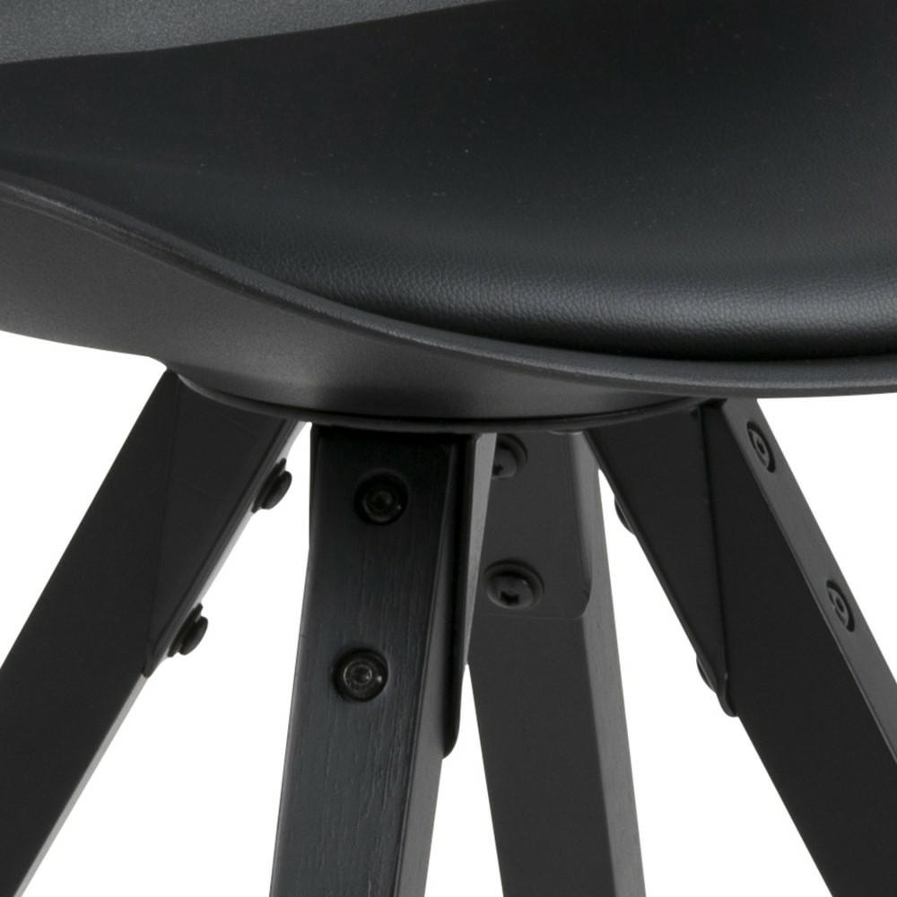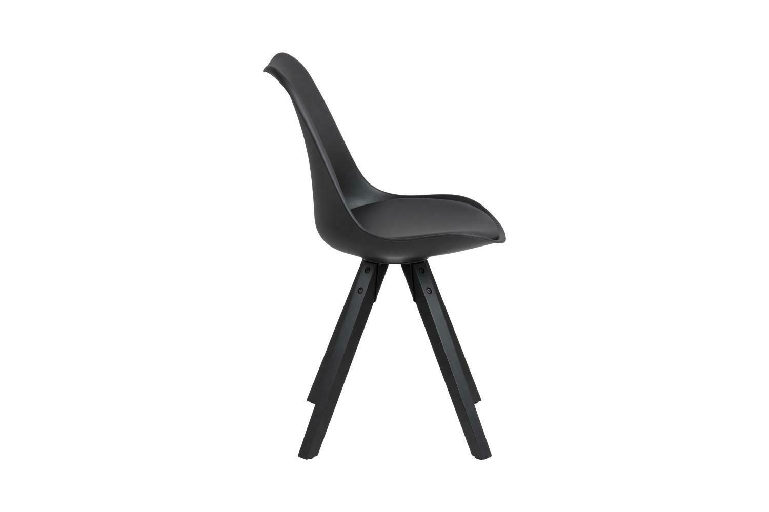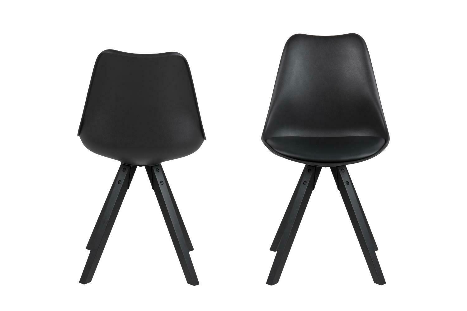 Krzesło Dima odznacza się prostą ale zachwycającą formą. Siedziko tapicerowane zostało skórą ekologiczną w kolorze czarnym. Podstawa wykonana została z drewna kauczukowego pomalowanego na kolor siedziska. Krzesło wymaga montażu.