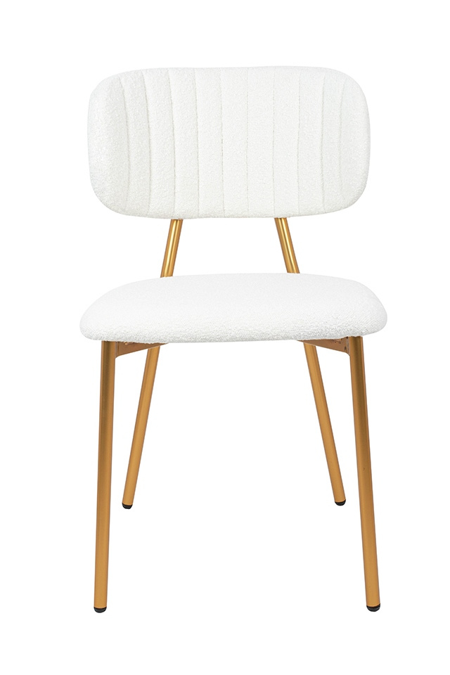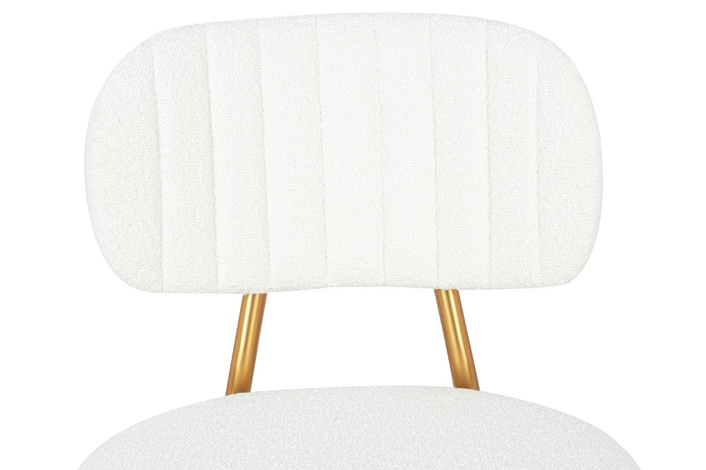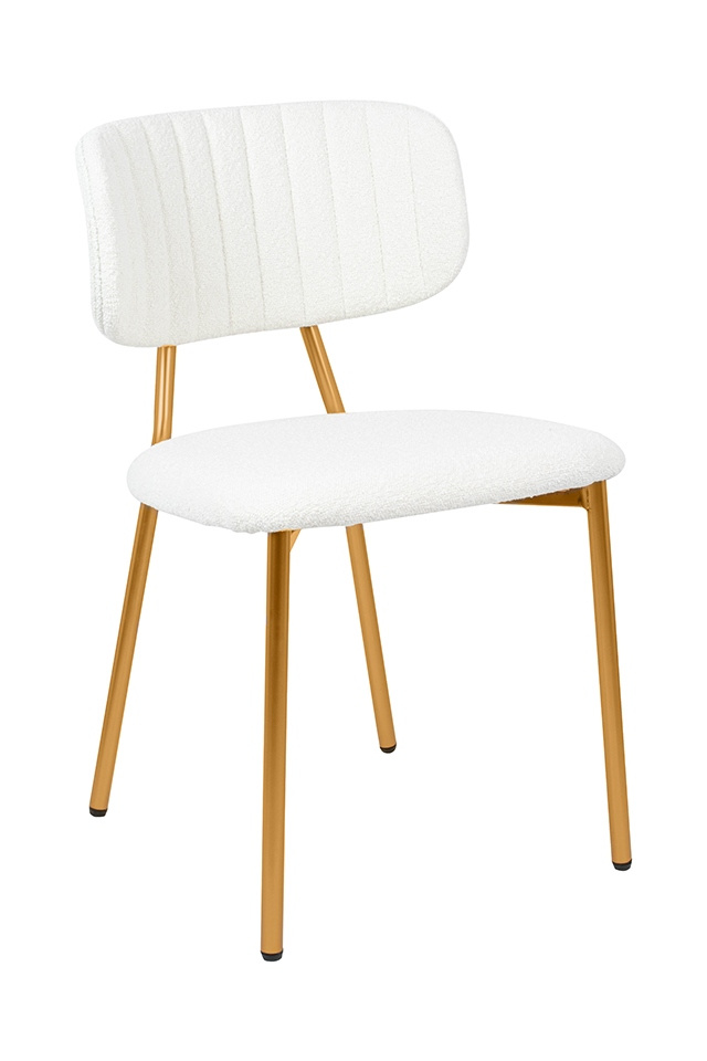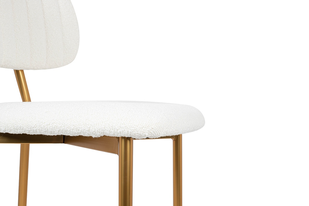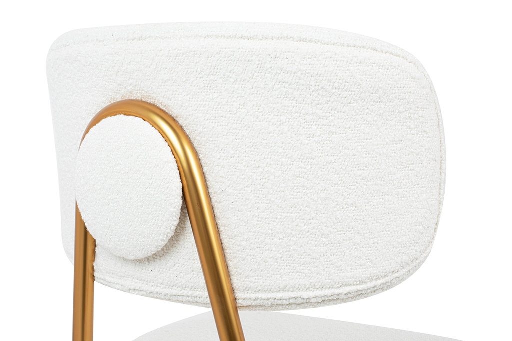 - Krzesło FABIOLA BOUCLE białe. Oparcie i siedzisko tapicerowane są przyjemną, miękką w dotyku tkaniną boucle w kolorze białym. Podstawa została wykonana z metalu lakierowanego na kolor satynowego złota. Przeszycia na oparciu podkreślają nowoczesny charakte