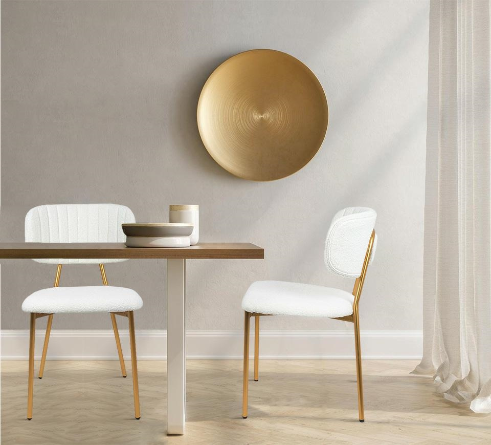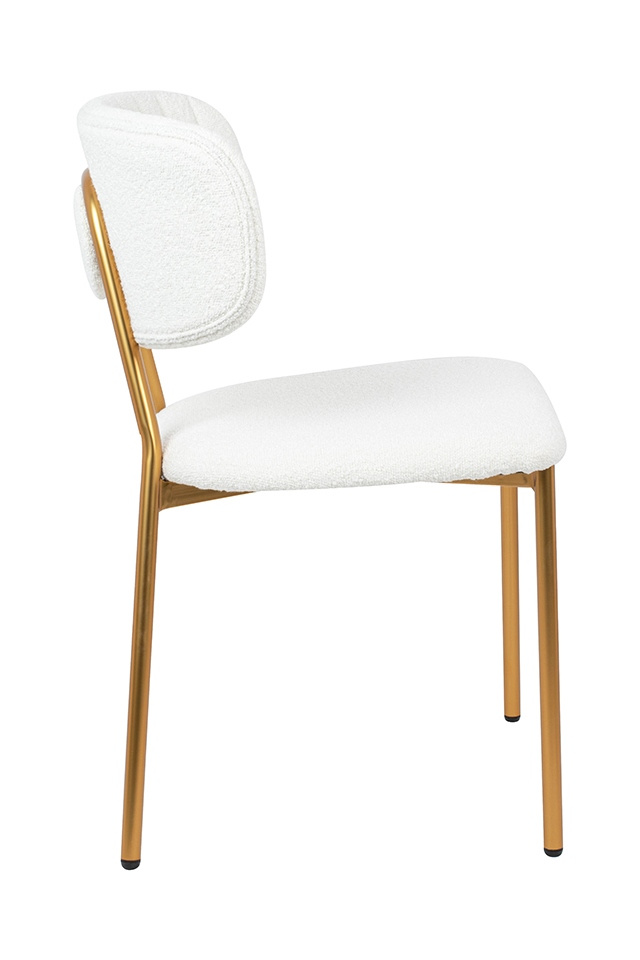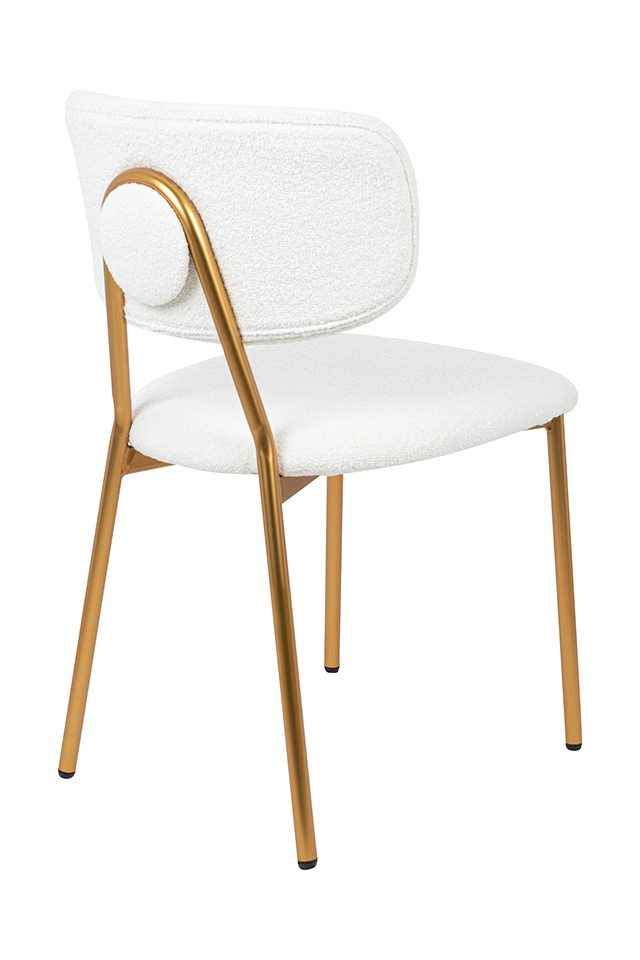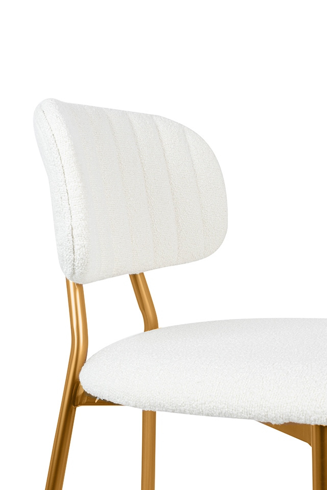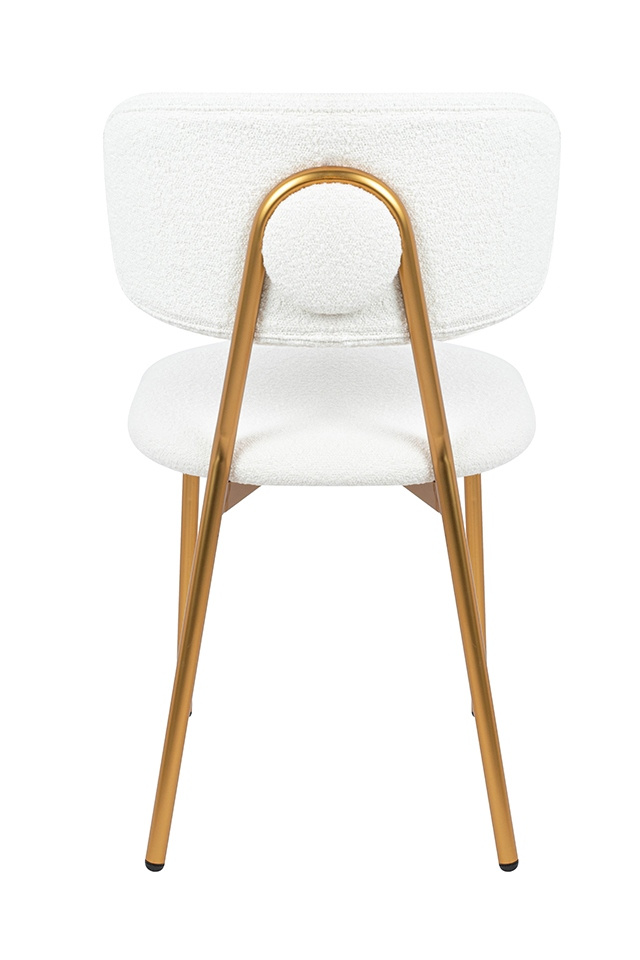 - Krzesło FABIOLA BOUCLE białe. Oparcie i siedzisko tapicerowane są przyjemną, miękką w dotyku tkaniną boucle w kolorze białym. Podstawa została wykonana z metalu lakierowanego na kolor satynowego złota. Przeszycia na oparciu podkreślają nowoczesny charakte