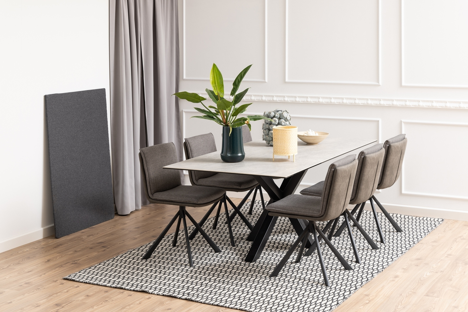 Krzesło Flynn to wyjątkowy, nowoczesny mebel. Dwukolorowe siedzisko to prosta konstrukcja z charakterystyczną poduszką. Aby uczynić go jeszcze bardziej interesującym, siedzisko i poduszka są tapicerowane dwiema różnymi tkaninami. Obrotowa podstawa podkreśla nowoczesny wygląd krzesła. Główne cechy Nowoczesne krzesło obrotowe do jadalni Charakterystyczne dwukolorowe siedzisko z poduszką Poduszka tapicerowana tkaninami w kolorze szarym i antracytowym Siedzisko tapicerowane antracytową tkaniną z mikrofibry ze specjalną powłoką zapewniającą surowy wygląd Francuskie szwy na poduszce Malowana proszkowo na czarno obrotowa podstawa Duński design chroniony wyłącznie dla Actona Ilość kartonów: 1 Wymiary kartonów: 58x52,5x51cm Waga kartonów: 9,6kg Wysokość oparcia 52,5 cm Szerokość siedziska 46 cm Głębokość siedziska 43 cmCechy produktu