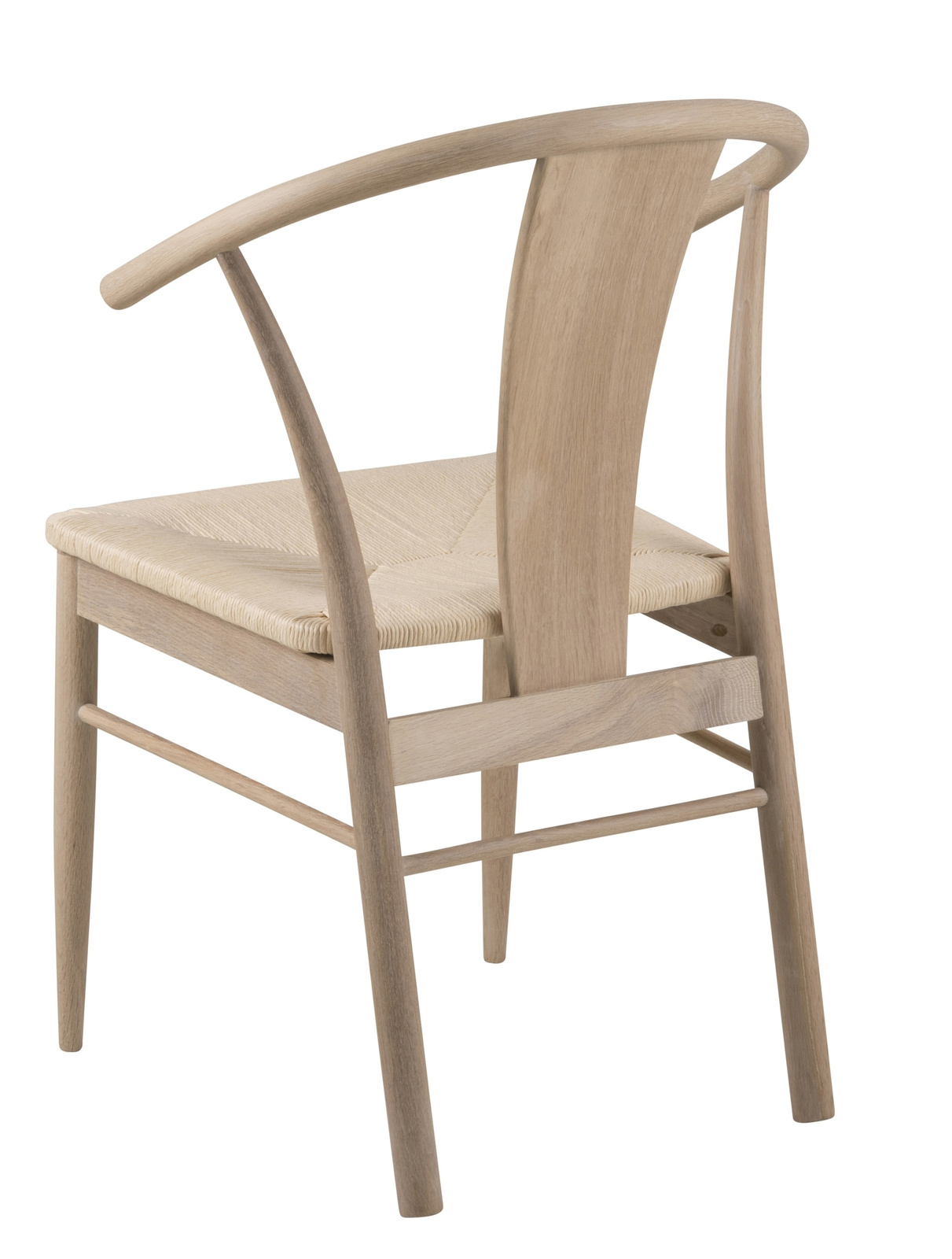Krzesło Janik wykonane jest z drewna dębowego w kolorze naturalnym. Siedzisko pokryte jest plecionką z papieru w kolorze naturalnym. Krzesło posiada także wyodne podłokietniki, które połączone są w jeden element z oparciem. Krzesło opiera się na czterech nóżkach zwężających się delikatnie ku dołowi. Krzesło pasuje idealnie do wnętrz w stylu skandynawskim.