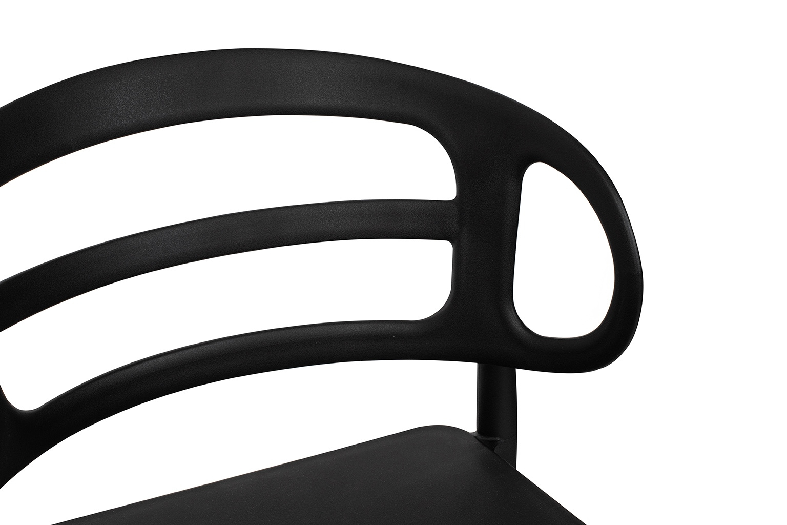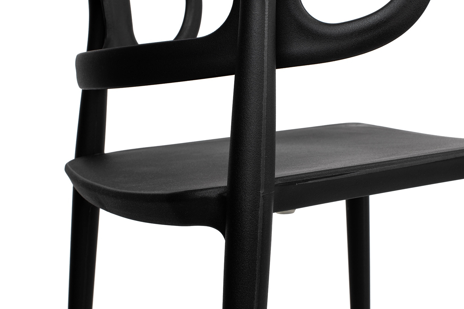 Krzesło MARCUS czarne - polipropylen. Krzesło wyróżnia się nowoczesną formą i funkcjonalnością, łącząc trwałość z estetycznym wyglądem. W całości wykonane z polipropylenu, wyjątkowo wytrzymałe i łatwe w pielęgnacji. Ergonomicznie wyprofilowane oparcie zapewnia wygodę nawet podczas dłuższego użytkowania. Posiada udźwig do 130 kg, co gwarantuje stabilność i komfort użytkowania. Świetnie sprawdzi się zarówno wewnątrz pomieszczeń, takich jak kuchnia, jadalnia czy salon, jak i na zewnątrz - na tarasie, balkonie lub w ogrodzie. Wymiary: wys. 78 cm / szer. 49 cm / gł. 52 cm Wysokość do krawędzi siedziska: 45 cm Wysokość do podłokietników: 72 cm Podłokietniki: dł. 13 cm / szer. 1 cm Siedzisko: szer. 40,5 cm / gł. 45,5 cm Oparcie: wys. 35 cm / szer. 44 cm Rozstaw nóg: przód szer. 44 cm / tył szer. 47 cm / gł. 46 cm / wys. 46 cm Możliwość sztaplowania: tak Wymiary opakowania: 62 cm / 51 cm / 88 cm.Cechy produktu