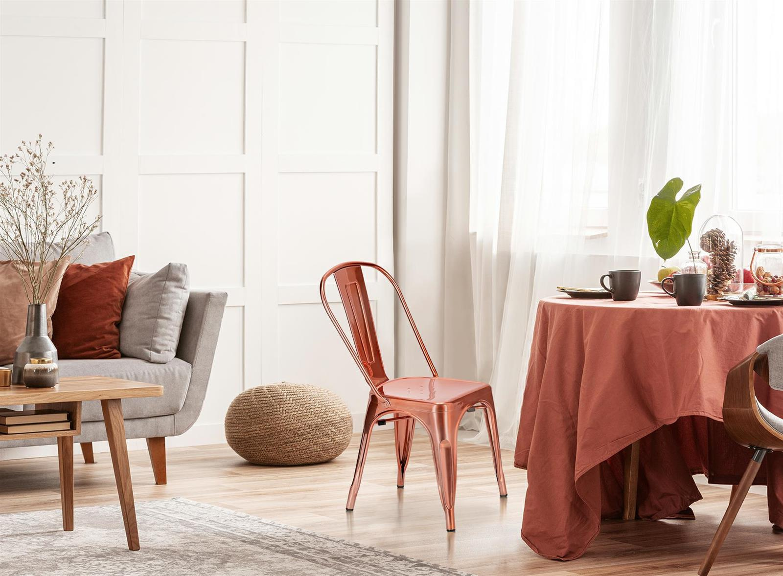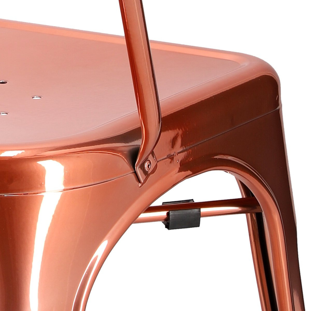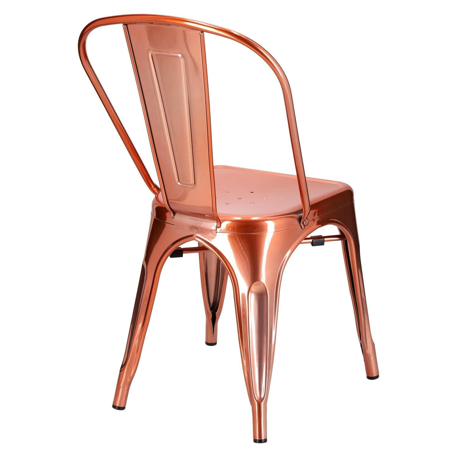 Doskonałe wzornictwo, wysoka jakość i duża wytrzymałość sprawiły, że meble Paris bardzo szybko zadomowiły się w kawiarniach, loftowych jadalniach, czy ogródkach gastronomicznych. Krzesło Paris miedziane wyznacza nowe standardy dla prostych mebli użytkowych. Ciekawa i modna kolorystyka rozjaśni wnętrze. Krzesło Paris miedziane jest dowodem, że metalowe krzesła nie tylko nadają się do loftowych i surowych pomieszczeń. Piękny odcień miedzi uzupełni wnętrze w stylu glamour lub boho. Paris to metalowe lakierowane krzesło, które wykończone jest w połysku. Nóżki krzesła zostały zabezpieczone czarnymCechy produktu