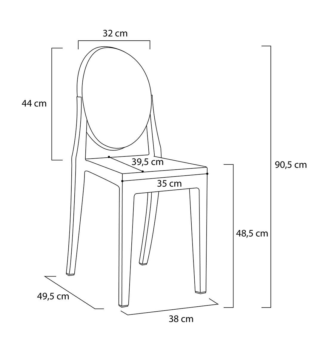 Krzesło VICTORIA transparentne - poliwęglan. Elegancja i komfort w jednym - świetnie sprawdzi się w każdym wnętrzu. Konstrukcja z wytrzymałego poliwęglanu o przezroczystym wykończeniu łączy w sobie styl i funkcjonalność, wprowadzając poczucie lekkości i świeżości. Świetnie komponuje się zarówno ze stylami nowoczesnym, jak i glamour, dodając wnętrzu charakteru. Doskonale sprawdzi się w salonie, przy toaletce, czy stylowych przestrzeniach komercyjnych. Można je sztaplować, co pozwala na wygodne przechowywanie. Zostało zaprojektowane tak, aby utrzymać obciążenie do 150 kg, łącząc solidną konstrukcję z komfortem użytkowania. Dostępne jest również w wersji barowej, co pozwala stworzyć spójny i elegancki zestaw mebli. Wymiary: wys. 90,5 cm / szer. 38 cm / gł. 49,5 cm Wysokość do krawędzi siedziska: 48,5 cm Siedzisko: szer. 35 cm / gł. 39,5 cm Oparcie: wys. 44 cm / szer. 32 cm Rozstaw nóg: szer. 36 cm / gł. 47 cm Waga netto: 4 kg Wymiary opakowania: 41 cm / 68 cm / 104 cm.Cechy produktu