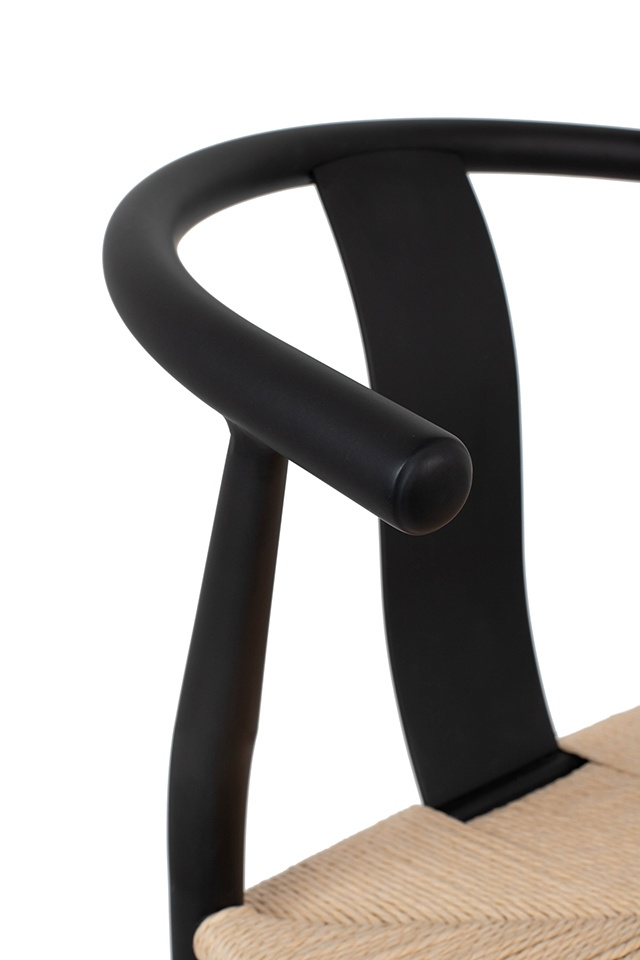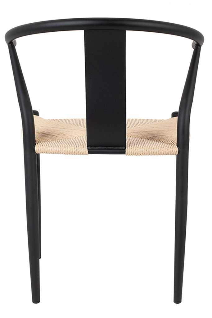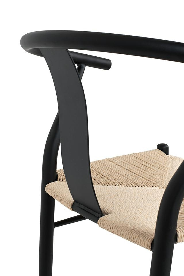 Krzesło WISHBONE METAL naturalne. Harmonijne połączenie surowego rzemiosła z ponadczasową elegancją Konstrukcja krzesła została wykonana z metalu o satynowym wykończeniu, które podkreśla jego nowoczesny i stylowy charakter. Siedzisko, plecione z naturalnych, jasnych włókien, zachwyca subtelnym urokiem i dodaje wnętrzu lekkości oraz ciepła. Czarny kolor nadaje krzesłu elegancji i nowoczesnego charakteru. Wytrzymałe wykonanie zapewnia bezpieczeństwo i komfort użytkowania do 130 kg. Doskonale sprawdzi się we wnętrzach urządzonych w stylu skandynawskim, boho, nowoczesnym lub minimalistycznym. Wymiary: wys. 75 cm / szer. 55 cm / gł. 50 cm Wysokość do krawędzi siedziska: 43 cm Wysokość do podłokietników: 70 cm Siedzisko: szer. 48 cm / gł. 41 cm Oparcie: wys. 35 cm / szer. 50 cm Rozstaw nóg: szer. przód 45 cm / szer. tył 41 cm / gł. 41 cm Waga netto: 7,2 kg Wymiary opakowania: 92 cm / 56,5 cm / 51,5 cm.