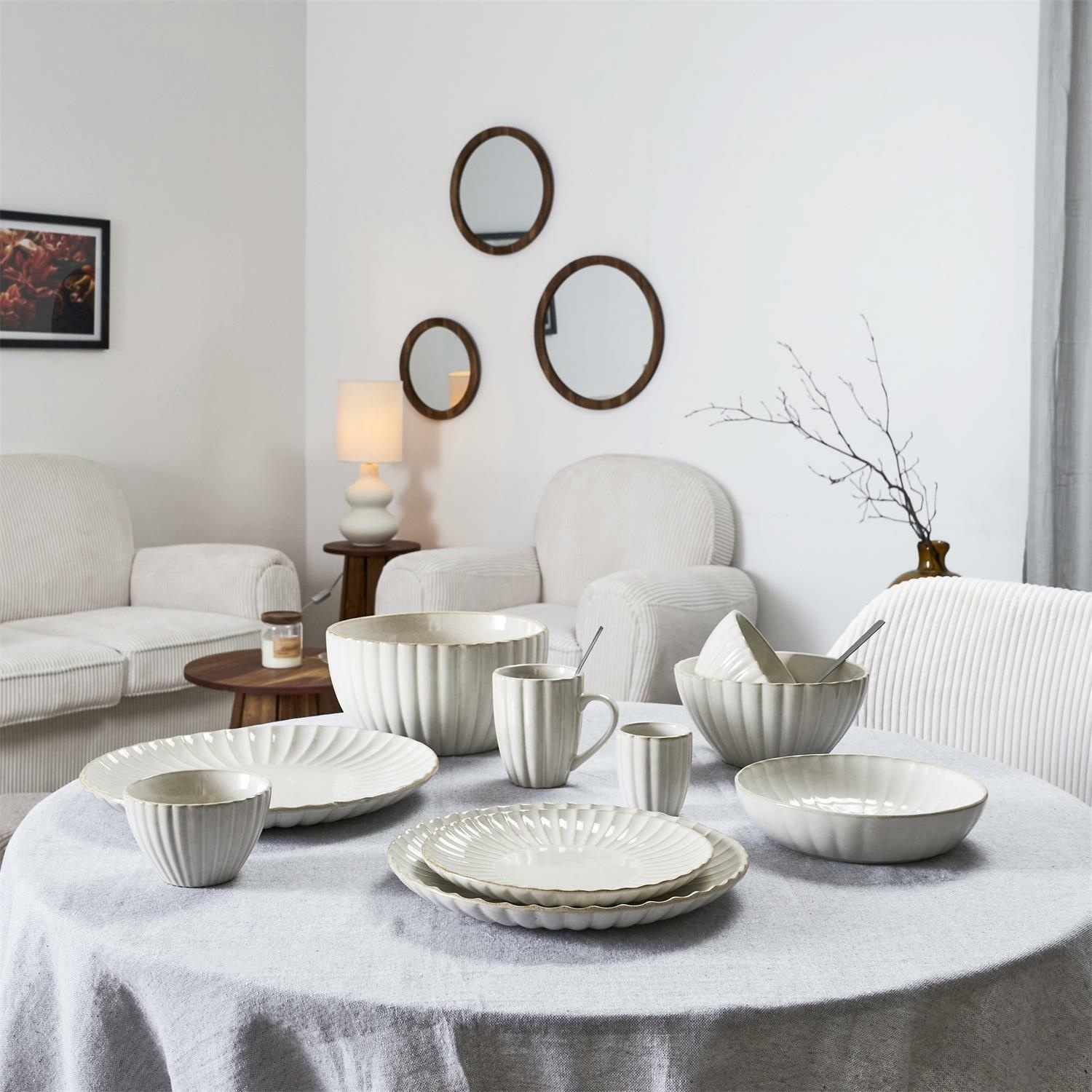 Kubek o pojemności 120ml Vlora to sztuka sama w sobie. Ciekawy kształt, delikatny, beżowy kolor sprawiają, że zastawa stołowa Vloga jest subtelna a zarazem ponadczasowa. Ryflowane brzegi miski przypominają trochę kształt morskiej muszelki. Kubek można myć w zmywarce, można używać w mikrofalówce. Nie można używać w piekarniku i w zamrażarce. Materiał: ceramikaCechy produktu