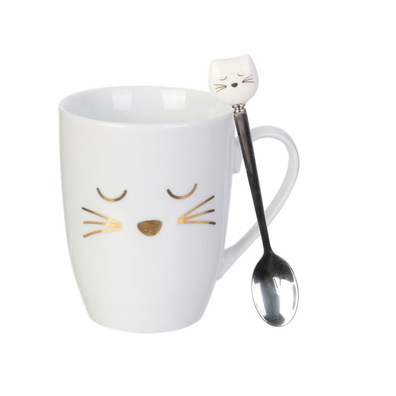 Ceramiczny kubek z łyżeczką o pojemności 350ml osłodzi każde śniadanie. Kubek ze złotymi ozdobami imitującymi pyszczek kota w zestawie posiada metalową łyżeczkę zakończoną porcelanową główką kota. Kobek i łyżeczka dzięki wspólnemu elementowi tworzą ciekawy komplet. Kubek zapakowany został w ozdobne pudełko, które sprawia, że jest on idealną propozycją na prezent dla nastolatki lub miłośnika kotów. Kubek można myć w zmywarce.