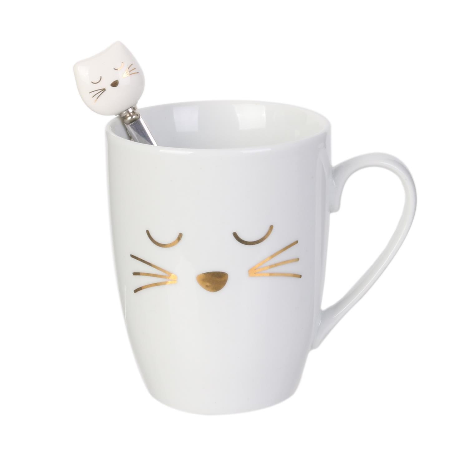 - Ceramiczny kubek z łyżeczką o pojemności 350ml osłodzi każde śniadanie. Kubek ze złotymi ozdobami imitującymi pyszczek kota w zestawie posiada metalową łyżeczkę zakończoną porcelanową główką kota. Kobek i łyżeczka dzięki wspólnemu elementowi tworzą ciekaw