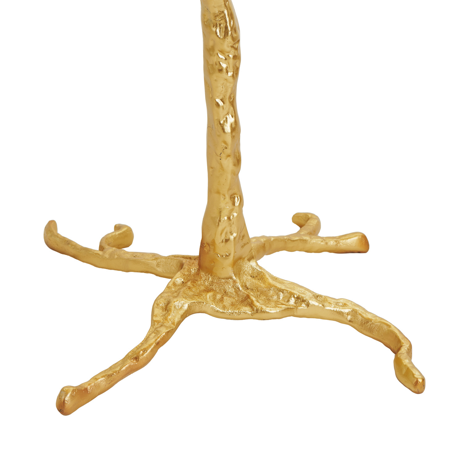 Lampa posiada stabilną metalową konstrukcję w kolorze złotym. Podstawa ma kształt w formie strusich nóżek
