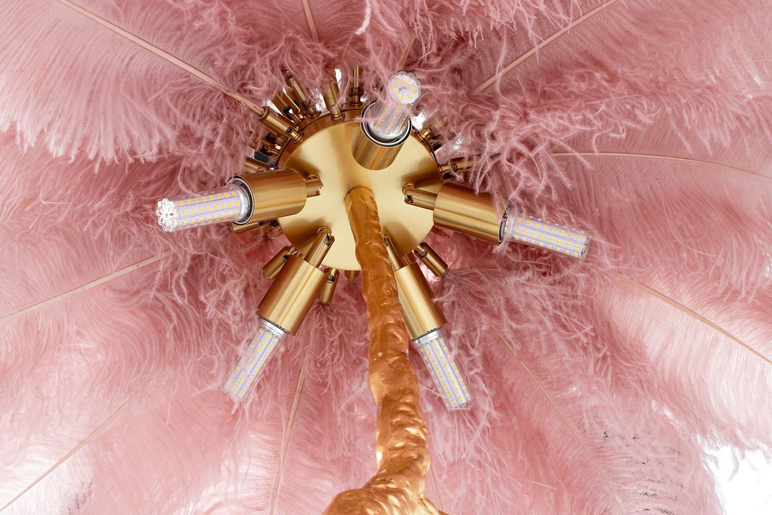 - Lampa podłogowa TIFFANY. Oryginalny projekt zainspirowany naturą, kształtem przypominający drzewo z liśćmi zastąpionymi ptasimi piórami. Klosz lampy tworzy 45 sztuk gęsto ułożonych, naturalnych strusich piór o długości 55-60 cm. Całość kompozycji w połącz