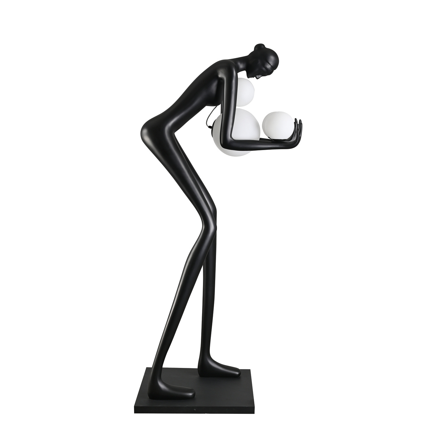 Niezwykle designerska lampa podłogowa WOMAN-2 przedstawiająca schyloną kobietę niosącą cztery mleczne klosze ze szkła.