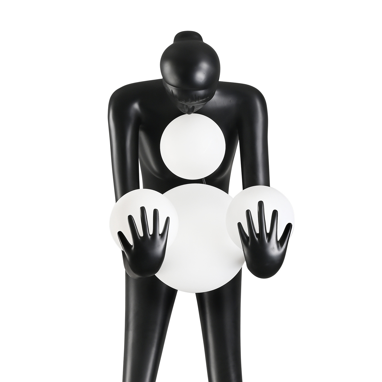 Rzeźbiarska forma lampy WOMAN-2 wykonana została z włókna szklanego, z czterema szklanymi kloszami w rozmiarach: 25 cm / 20 cm / 17 cm.
