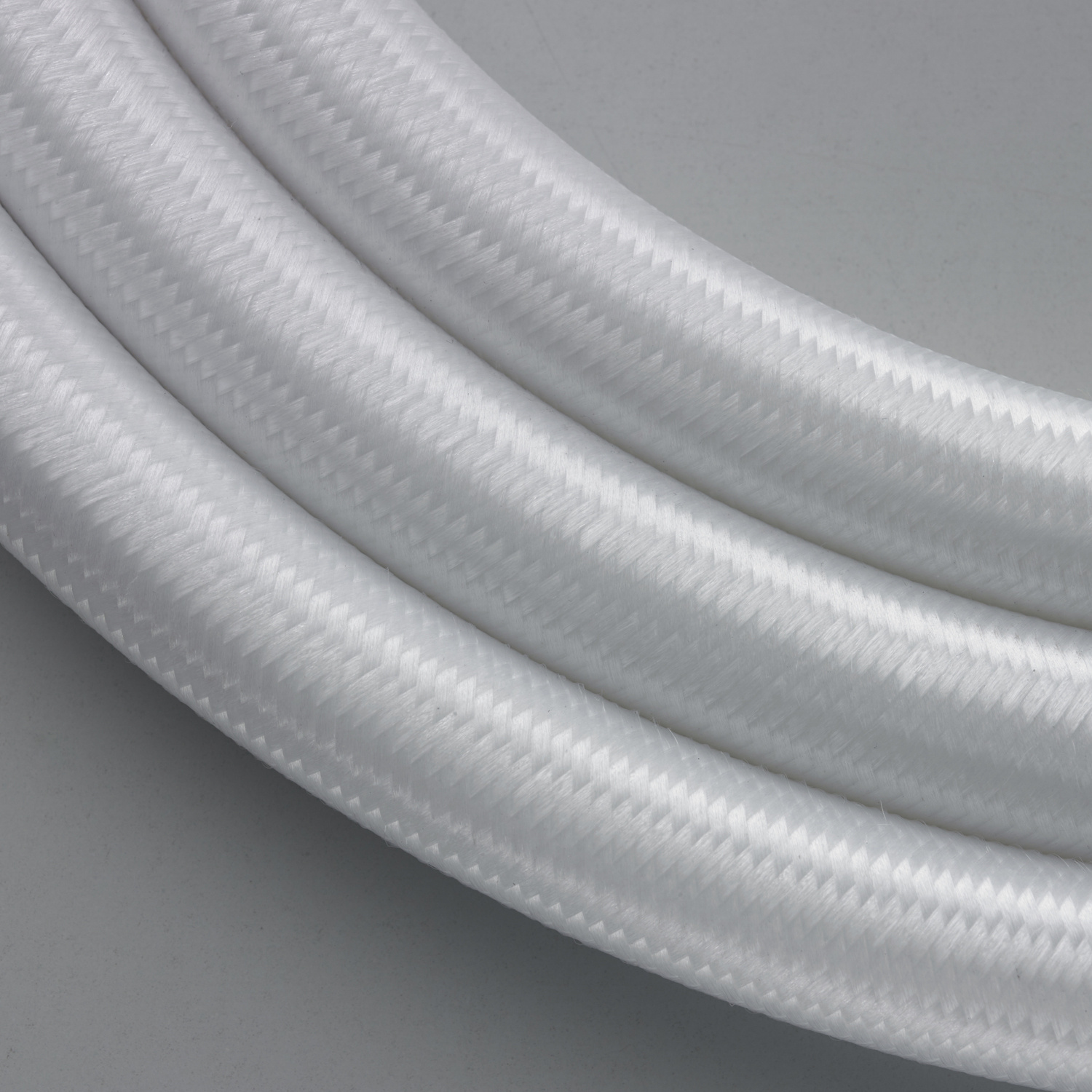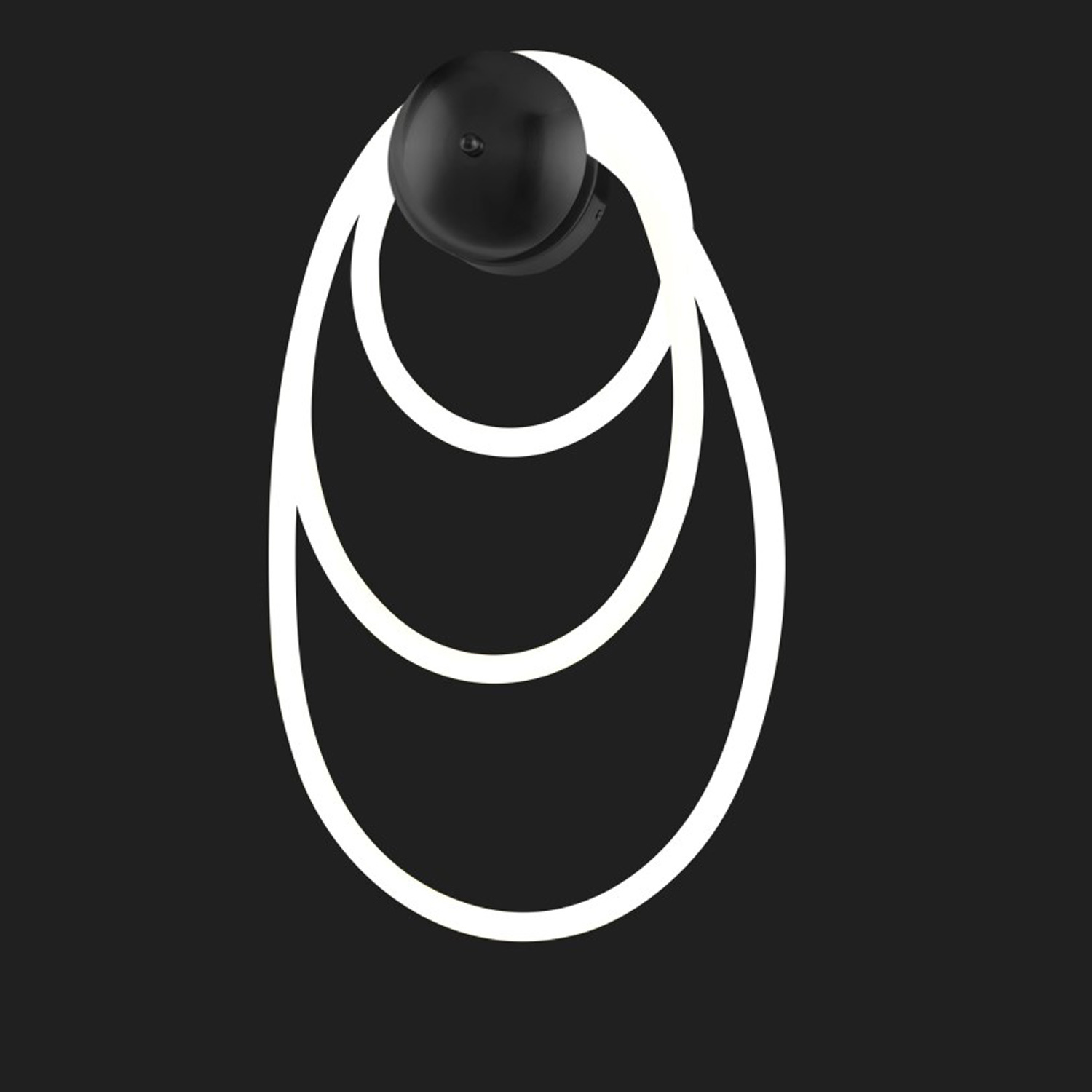 Z okrągłej, czarnej rozety swobodnie opadają elastyczne pierścienie świetlne w oplocie z białej tkaniny, tworząc efektowną kompozycję trzech obręczy o różnych średnicach.
