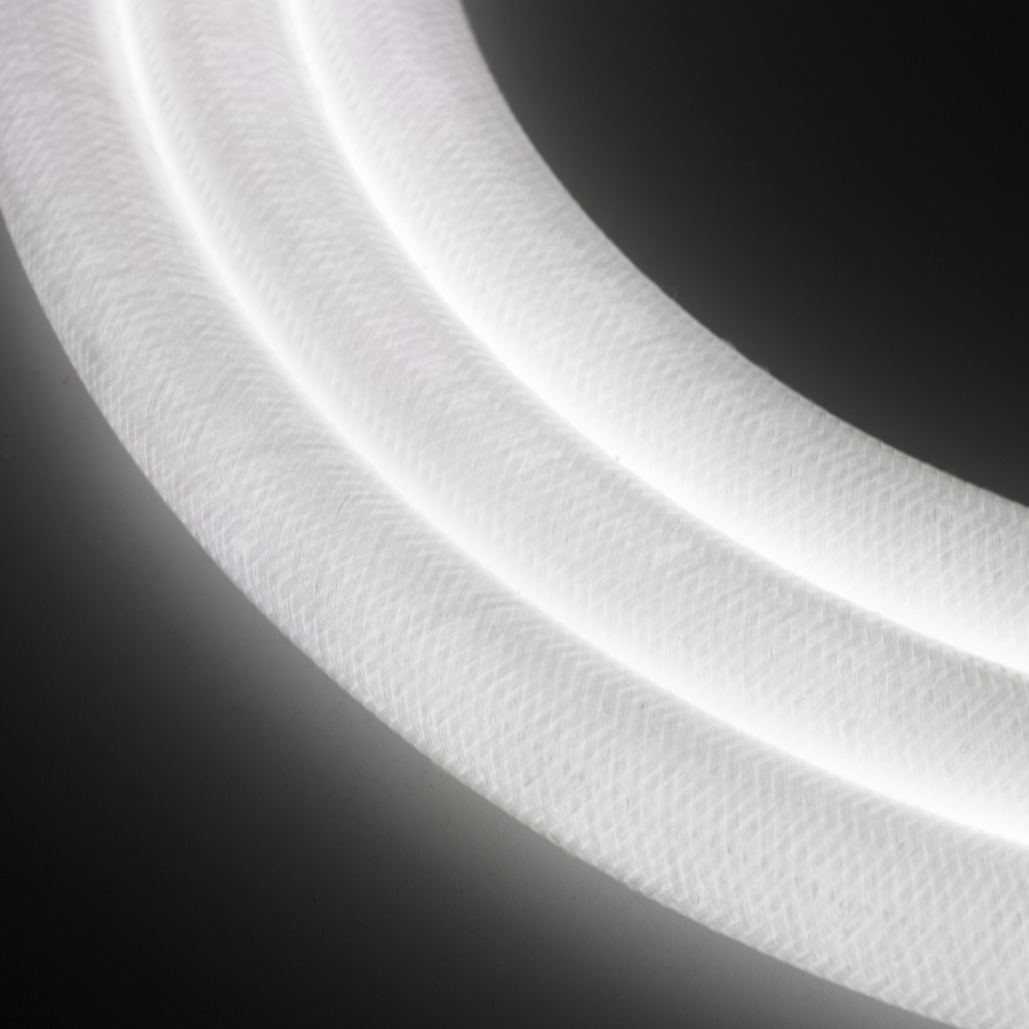 Elastyczne świetlne okręgi emitują ciepłe, miękkie światło, które odbijając się od jasnej tkaniny, tworzy subtelną, rozproszoną poświatę.