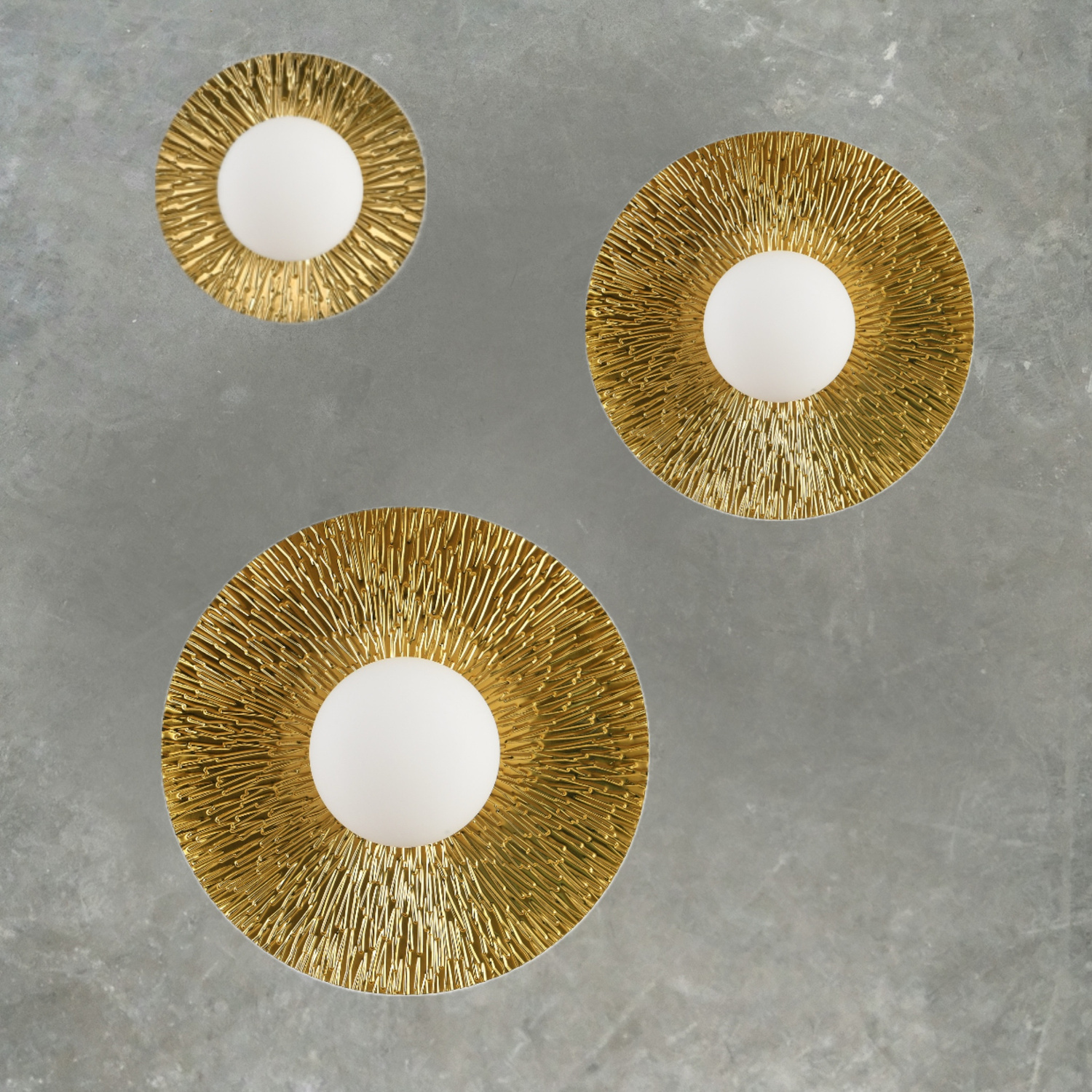 Lampa ścienna SUN to dekoracyjny, nowoczesny kinkiet o okrągłym kształcie w kolorze złotym.