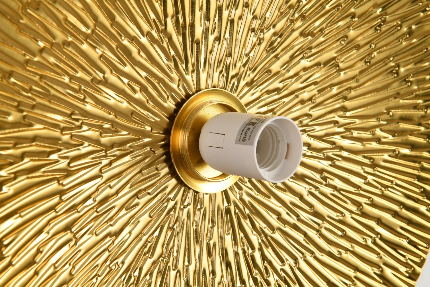 Złoty Kinkiet SUN ma formę okrągłej tarczy o średnicy 20 cm, z centralnie umieszczonym, okrągłym otworem na źródło światła.