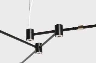 Trzy smukłe, czarne ramiona rozchodzą się z centralnego mocowania sufitowego, a każdy z nich zakończony jest półokrągłym kloszem w kolorze czarnym z białym wnętrzem.