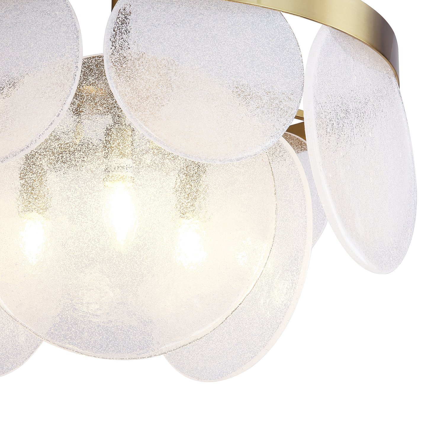 Do okręgu przymocowane są nakładające się na siebie, elementy dekoracyjne - okrągłe plastry wykonane z unikatowego, ręcznie formowanego szkła.