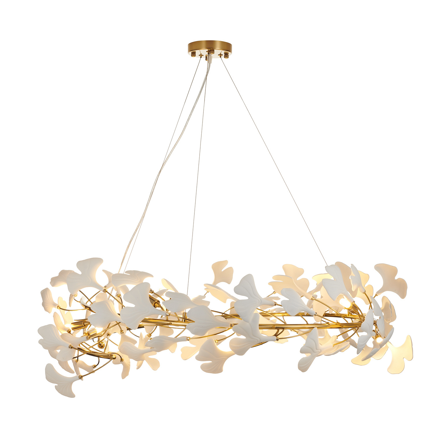 - Białe, ceramiczne listki w stylu liści Ginkgo, o matowym wykończeniu, tworzą subtelny kontrast i nadają lampie unikalny, rzeźbiarski charakter.