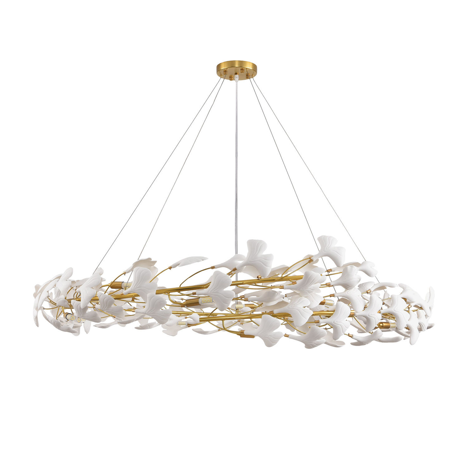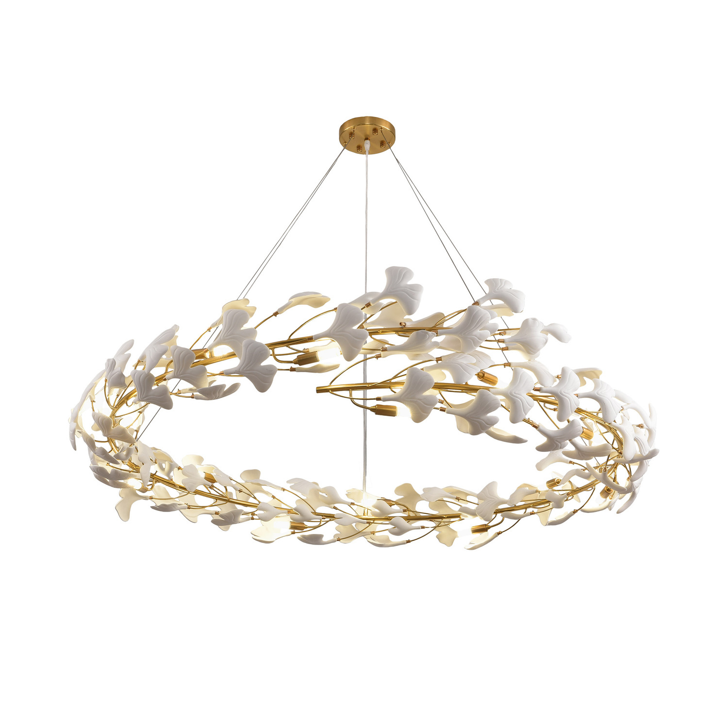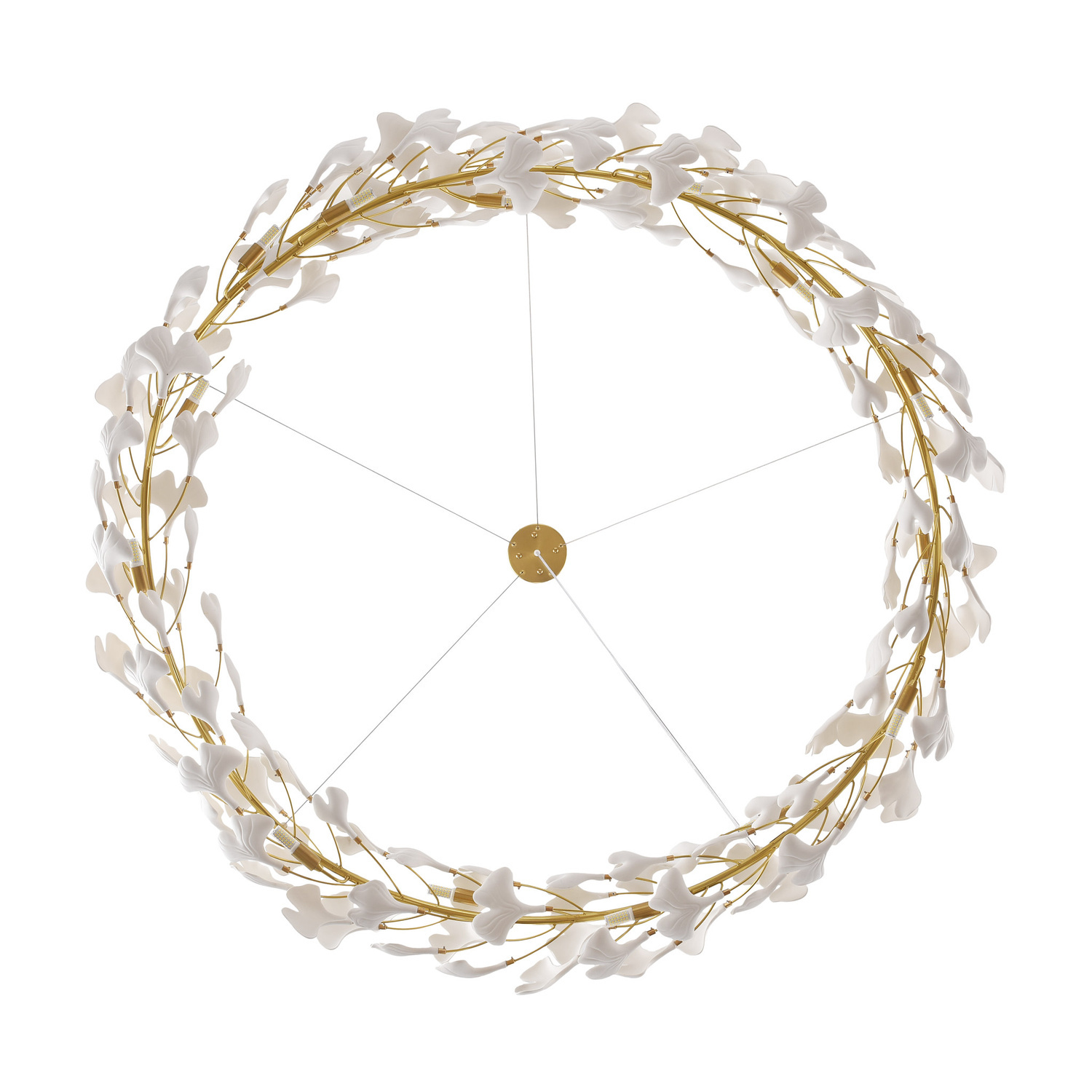 Lśniący, złoty stelaż oplatają delikatne ceramiczne listki, tworząc niezwykle dekoracyjny, niemal florystyczny wieniec światła.