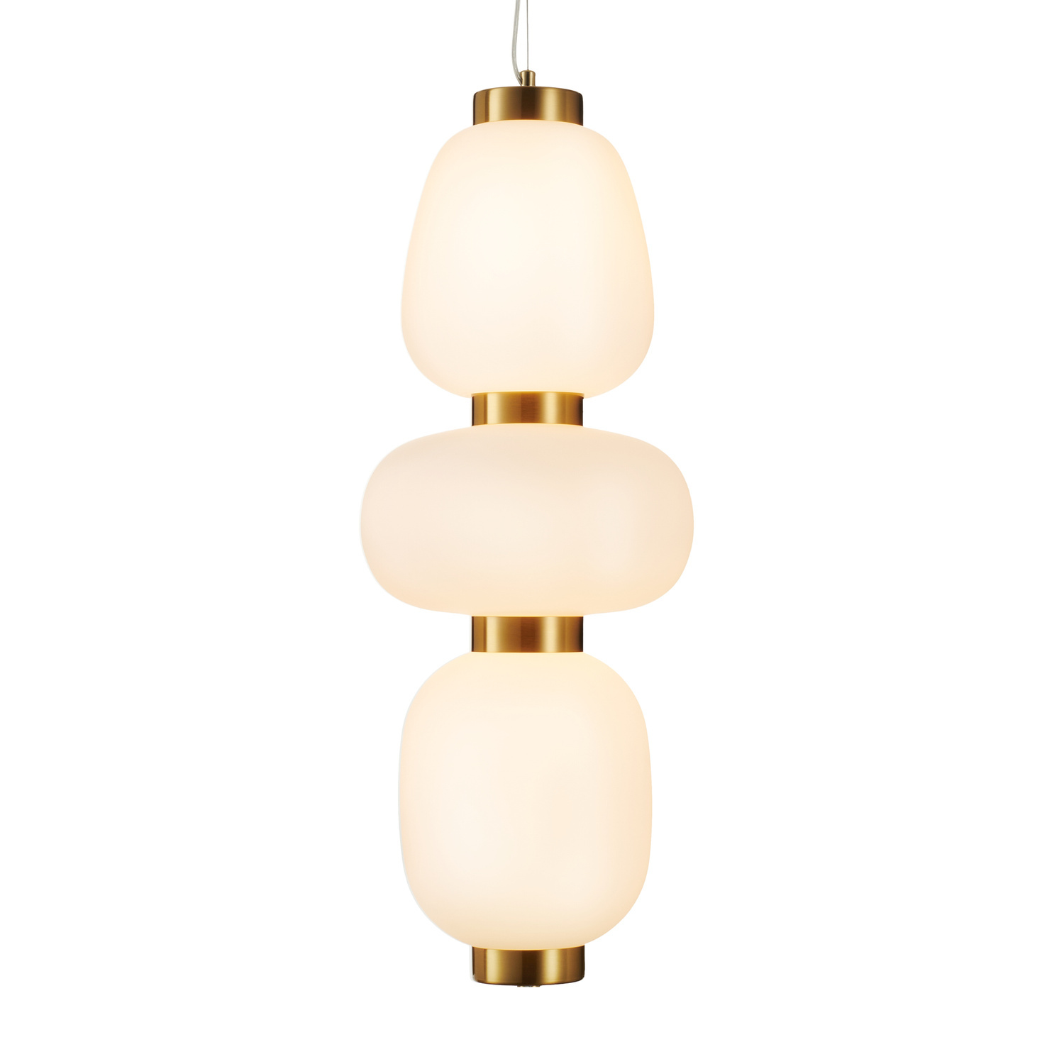 Luksusowa, pionowa lampa wisząca BRILLA-3 przypomina trzy białe kamienie lub nieregularne perły słodkowodne.