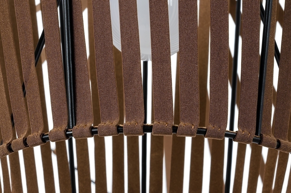 - Lampa wisząca Capello Fi 100 w kolorze kawowym. Obręcz wykonana została z tworzywa sztucznego w kolorze czarnym. Obręcz za pomocą poliestrowych tasiemek w kolorze kawowym jest połączona z wewnętrznym kloszem, skrywającym żarówkę. Tworząc lekką konstrukcję