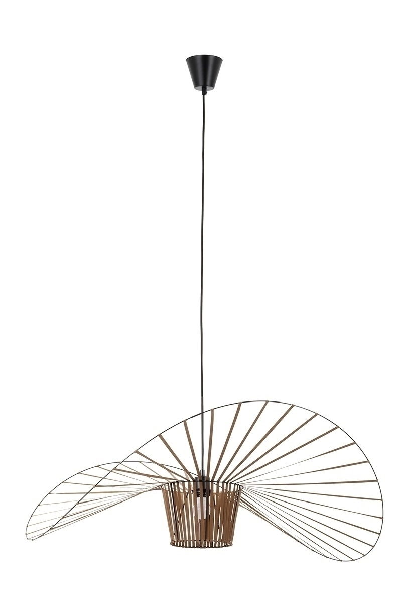 Lampa wisząca Capello Fi 100 w kolorze kawowym. Obręcz wykonana została z tworzywa sztucznego w kolorze czarnym. Obręcz za pomocą poliestrowych tasiemek w kolorze kawowym jest połączona z wewnętrznym kloszem, skrywającym żarówkę. Tworząc lekką konstrukcję, przypominającą kształtem elegancki damski kapelusz. Dzięki lekkiej konstrukcji, lampa pod wpływem ruchów powietrza może się poruszać. Lampa wyposażona w czarny przewód i czarną podsufitkę. Capello dostępna jest też w innych rozmiarach i kolorach. Światło: E27 max. 40 W (brak w zestawie) Oprawa: wys. 222 cm / szer. 100 cm / gł. 100 cm Klosz: wys. 22 cm / szer. 100 cm Przewód: 200 cm Montaż: instalacja sufitowa Waga netto: 1,4 kg Wymiary opakowania: 66 cm / 66 cm / 23 cm.Cechy produktu