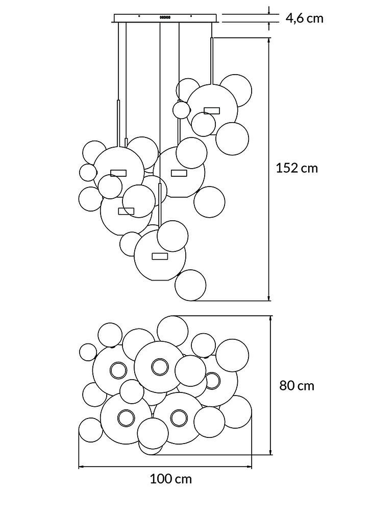 Pięć głównych kul zawieszonych zostało na przewodach, wychodzących z jednej podsufitki.