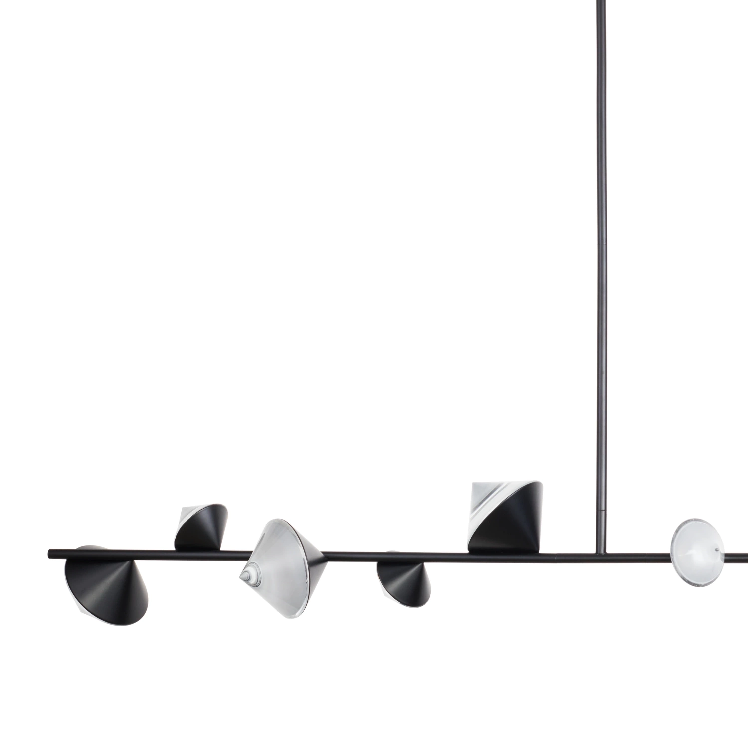 Klosze w kształcie stożka są rozmieszczone po przeciwnych stronach stelaża, nadając oprawie niezwykle dekoracyjny wygląd.