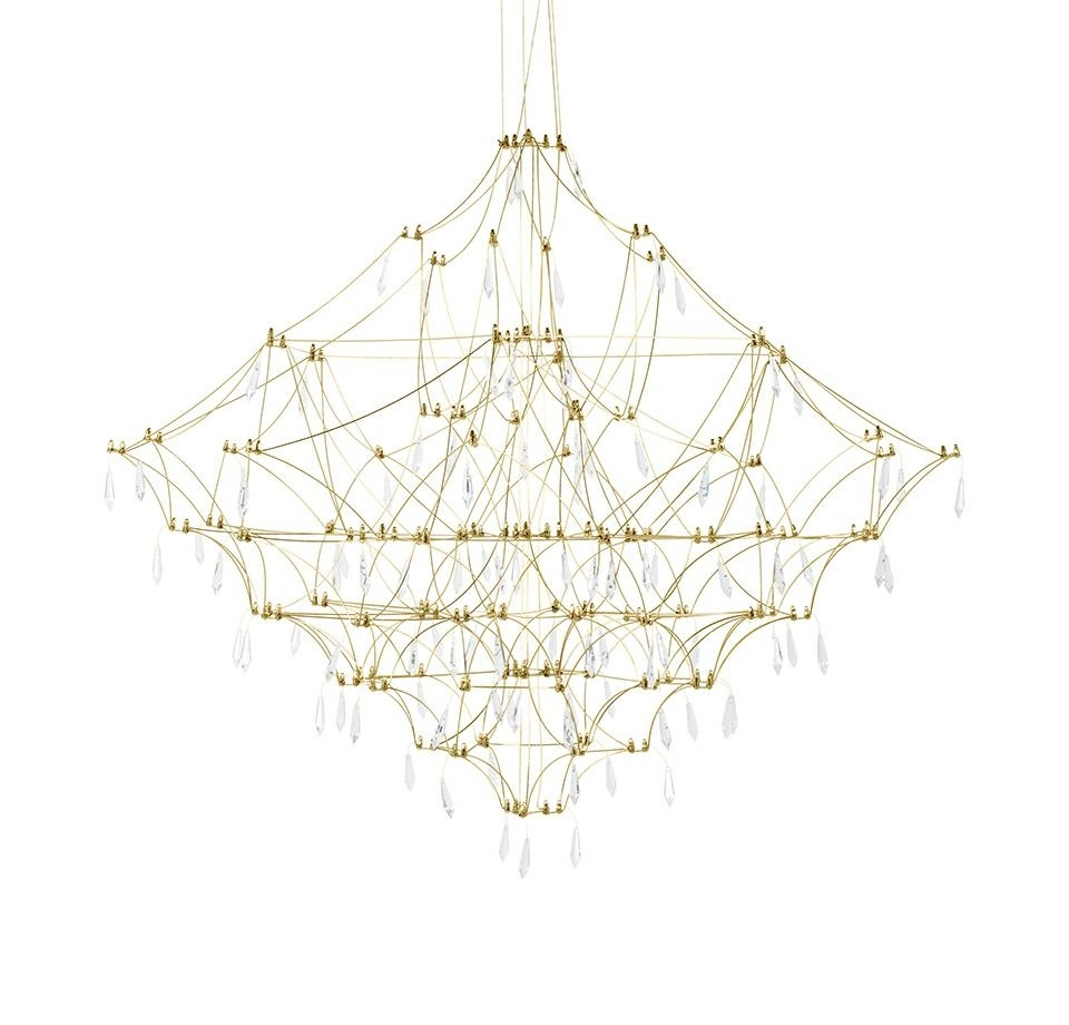 - Lampa Constelation 100 Gold. Konstrukcja lampy wykonana została ze stali szczotkowanej w kolorze złotym. Metalowa pajęczyna, połączona z ledowymi źródłami światła tworzy wyjątkowo elegancką konstrukcję. Całość została wykończona dekoracyjnymi kryształkami