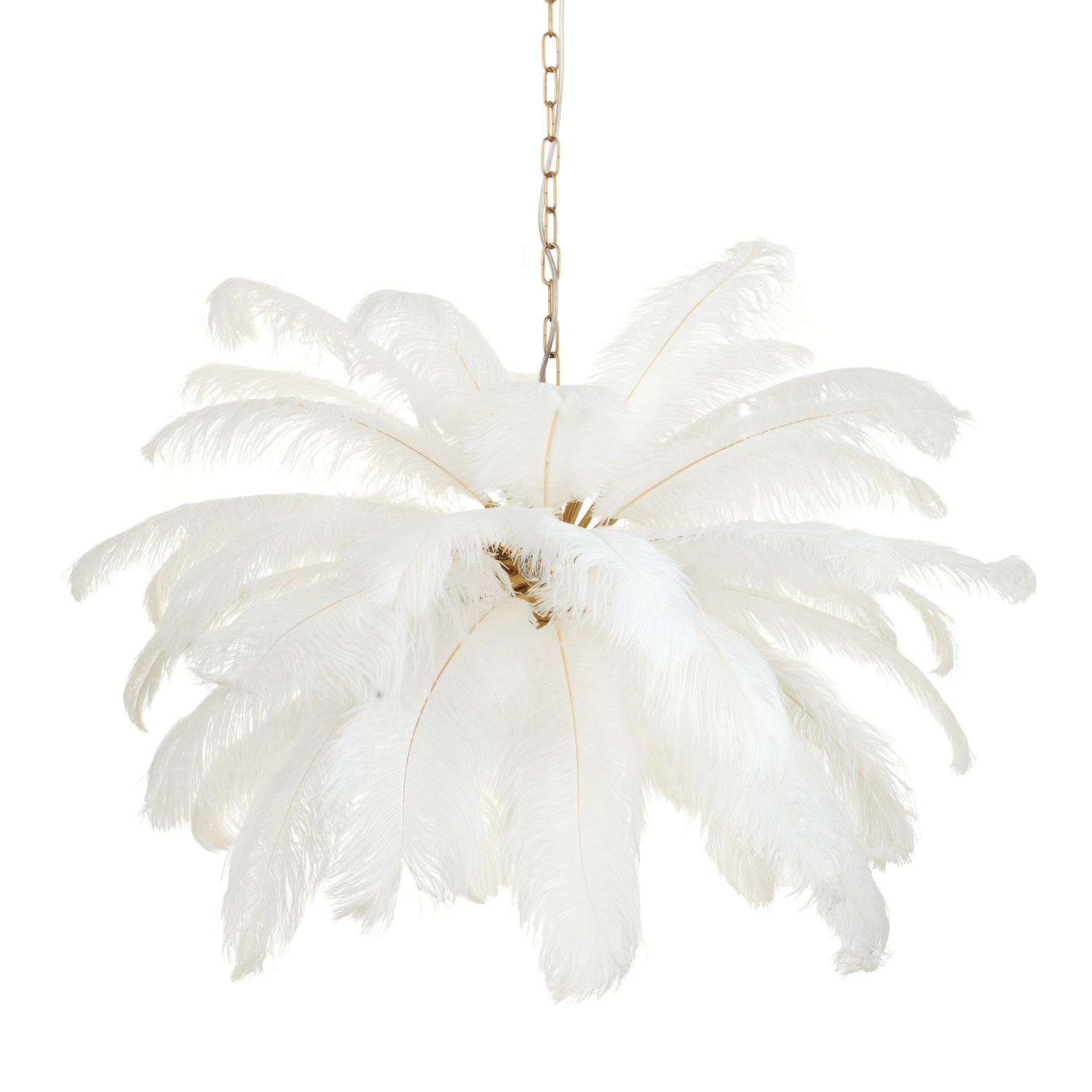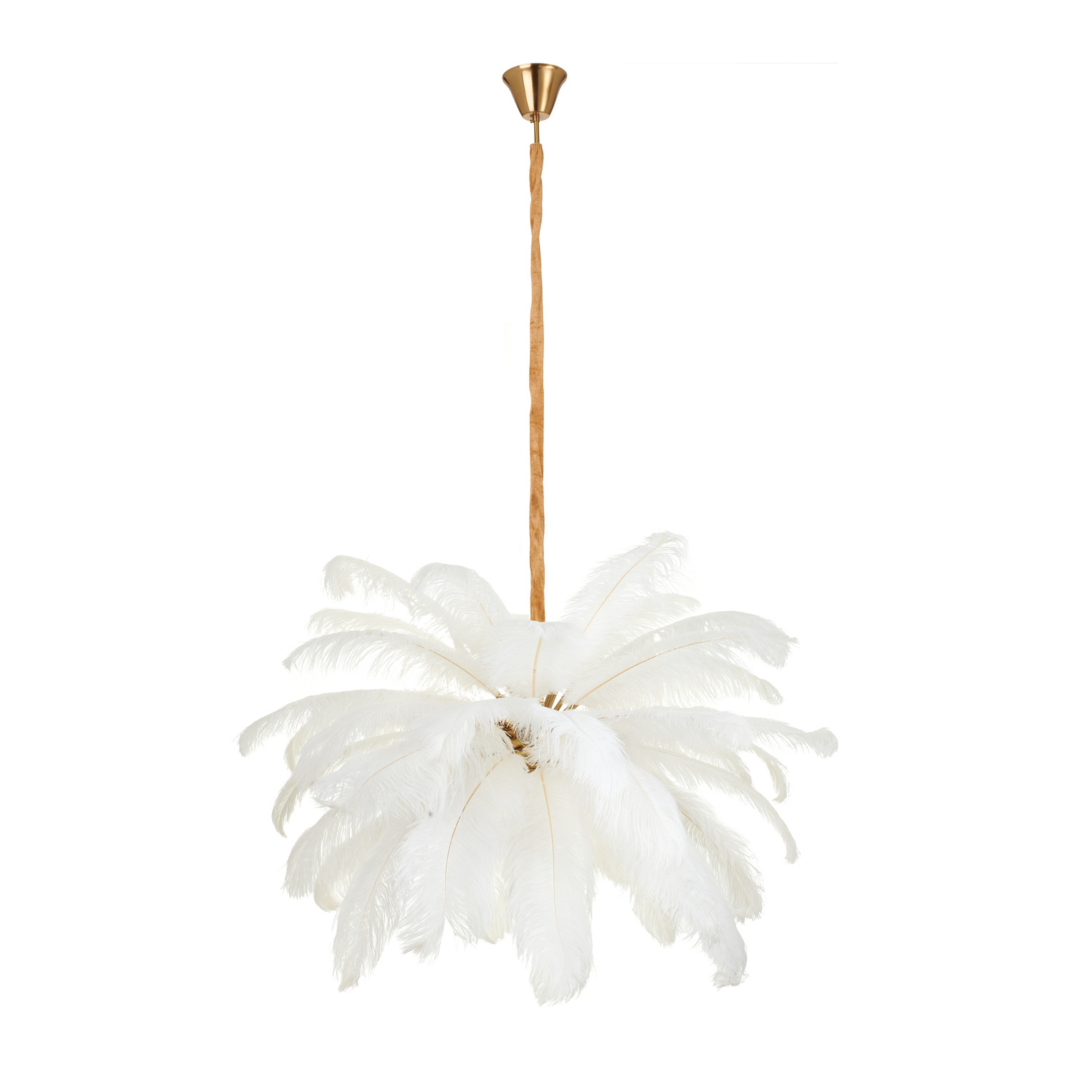 Kolorystyka lampy jest stonowana i elegancka. Białe pióra kontrastują z delikatnym, złotym wykończeniem u góry, gdzie znajduje się mocowanie do żarówki.