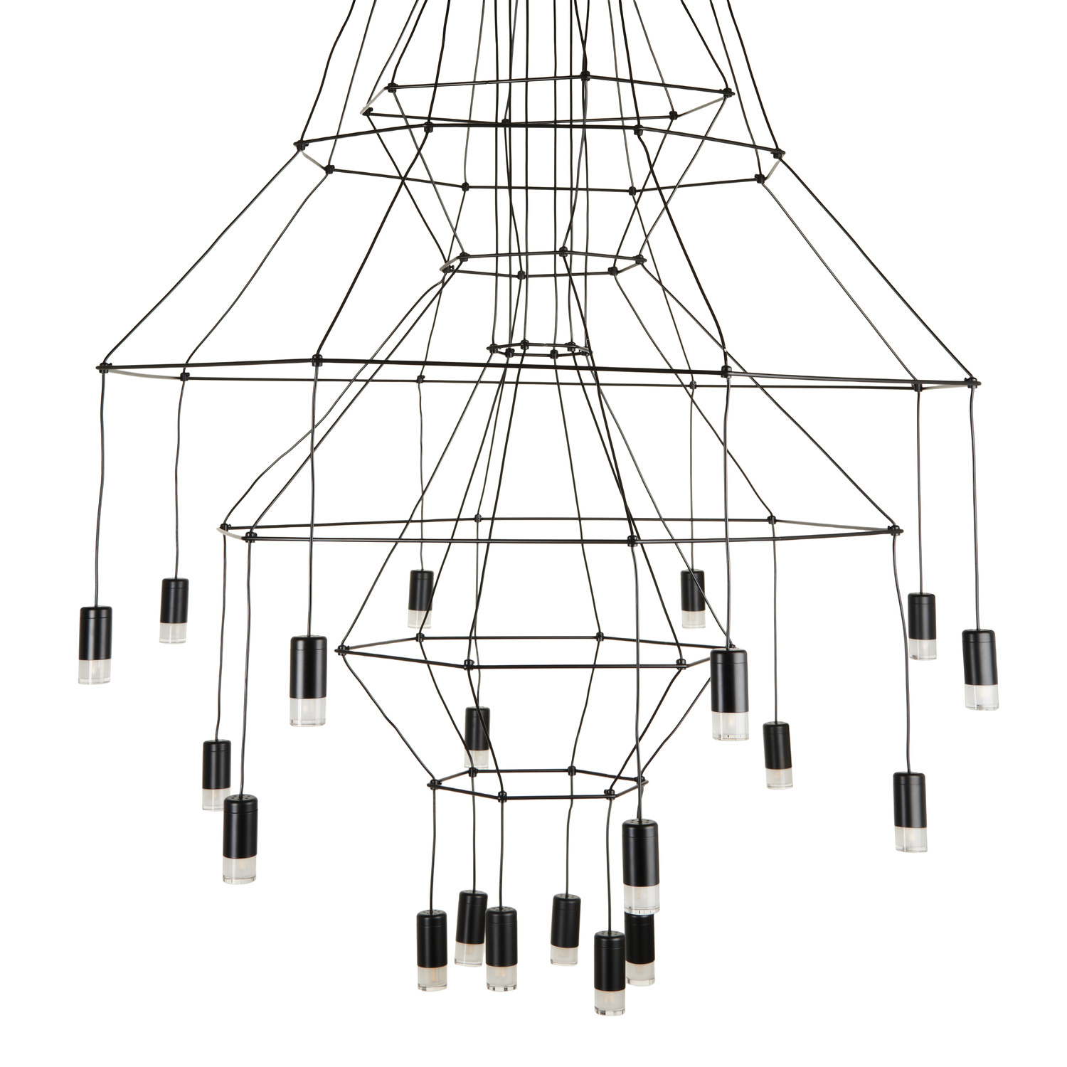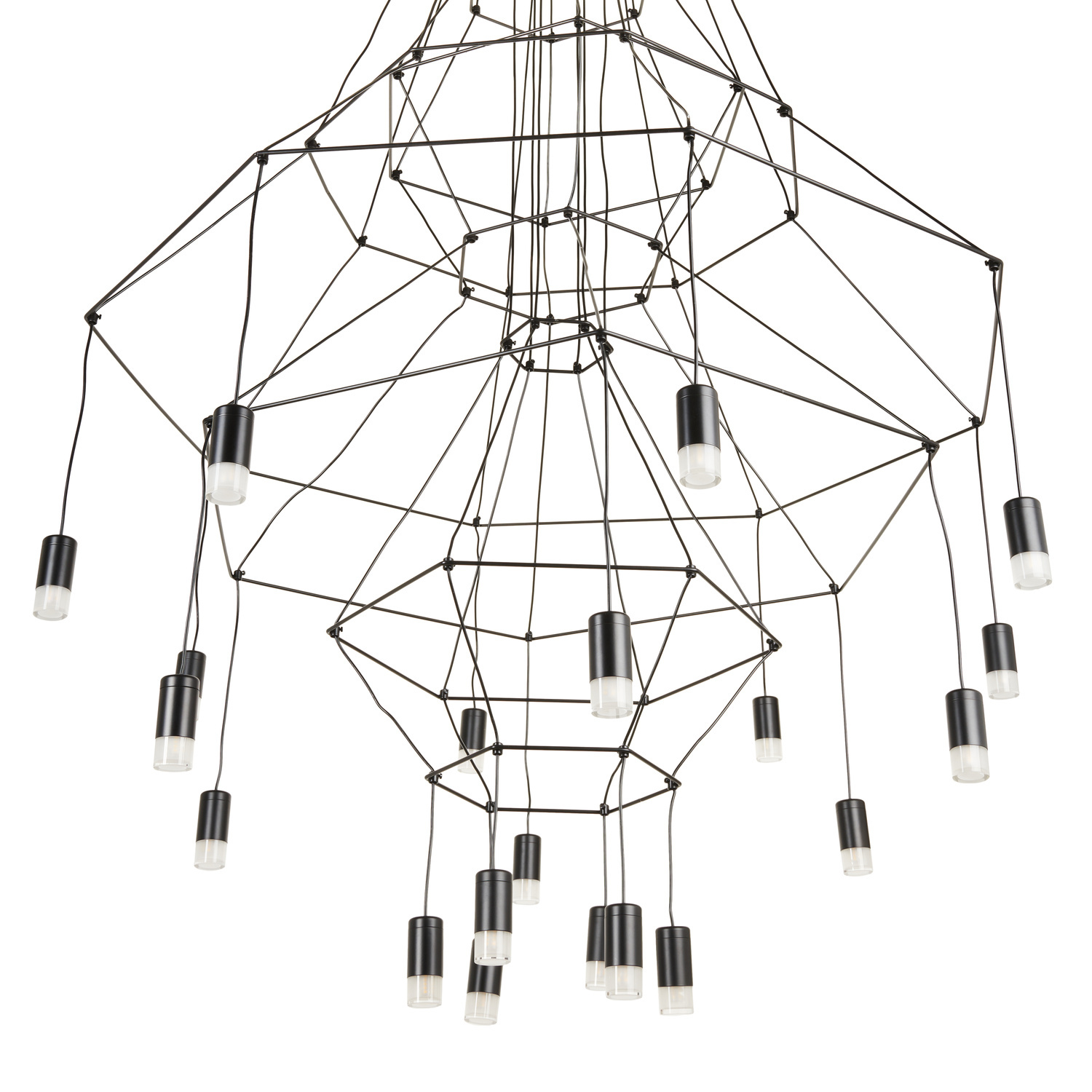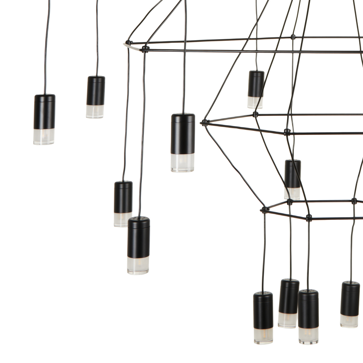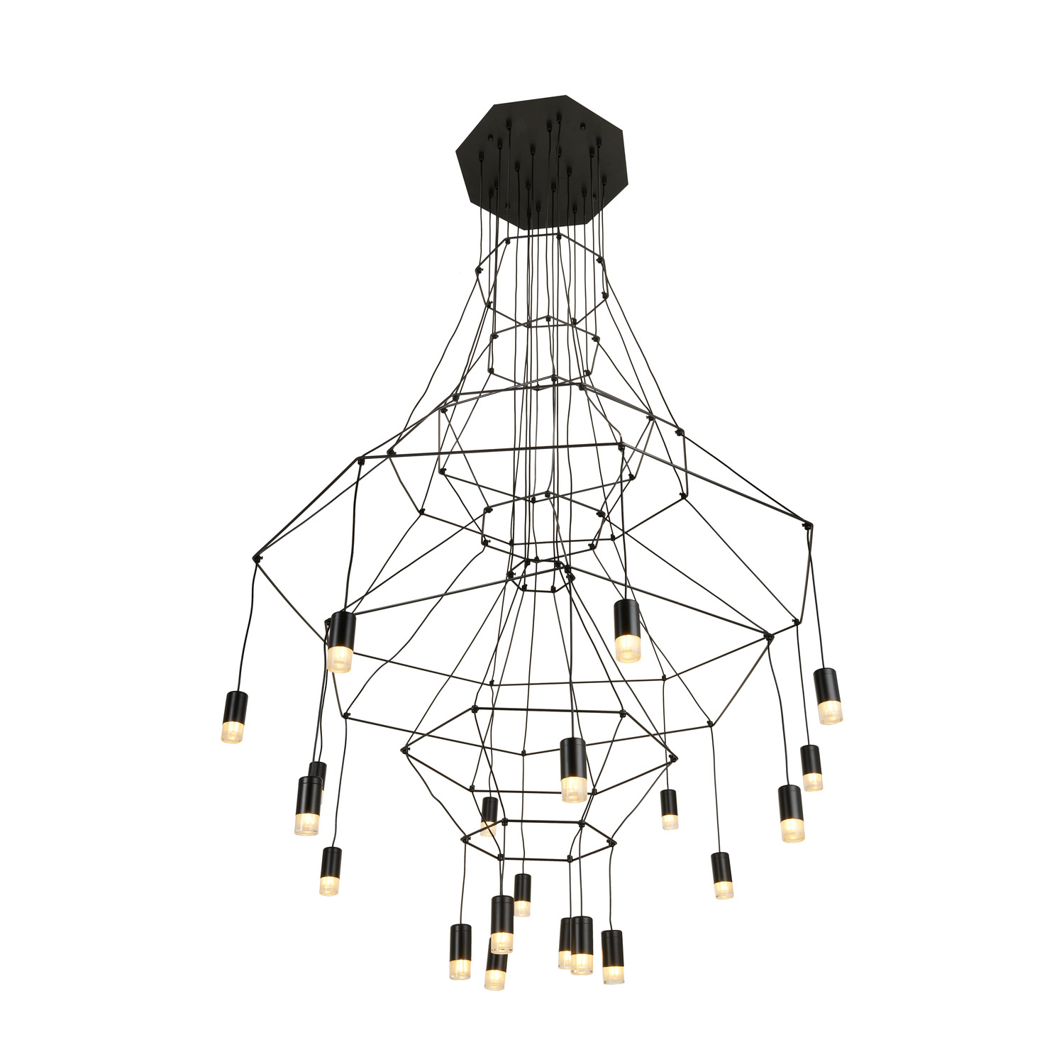 Nowoczesny żyrandol LINEA 20 to efektowna lampa wisząca o ażurowej, geometrycznej konstrukcji, idealna do wysokich wnętrz. Czarne, cienkie pręty tworzą wielopoziomową, przestrzenną formę, która nadaje lampie industrialny i minimalistyczny charakter.