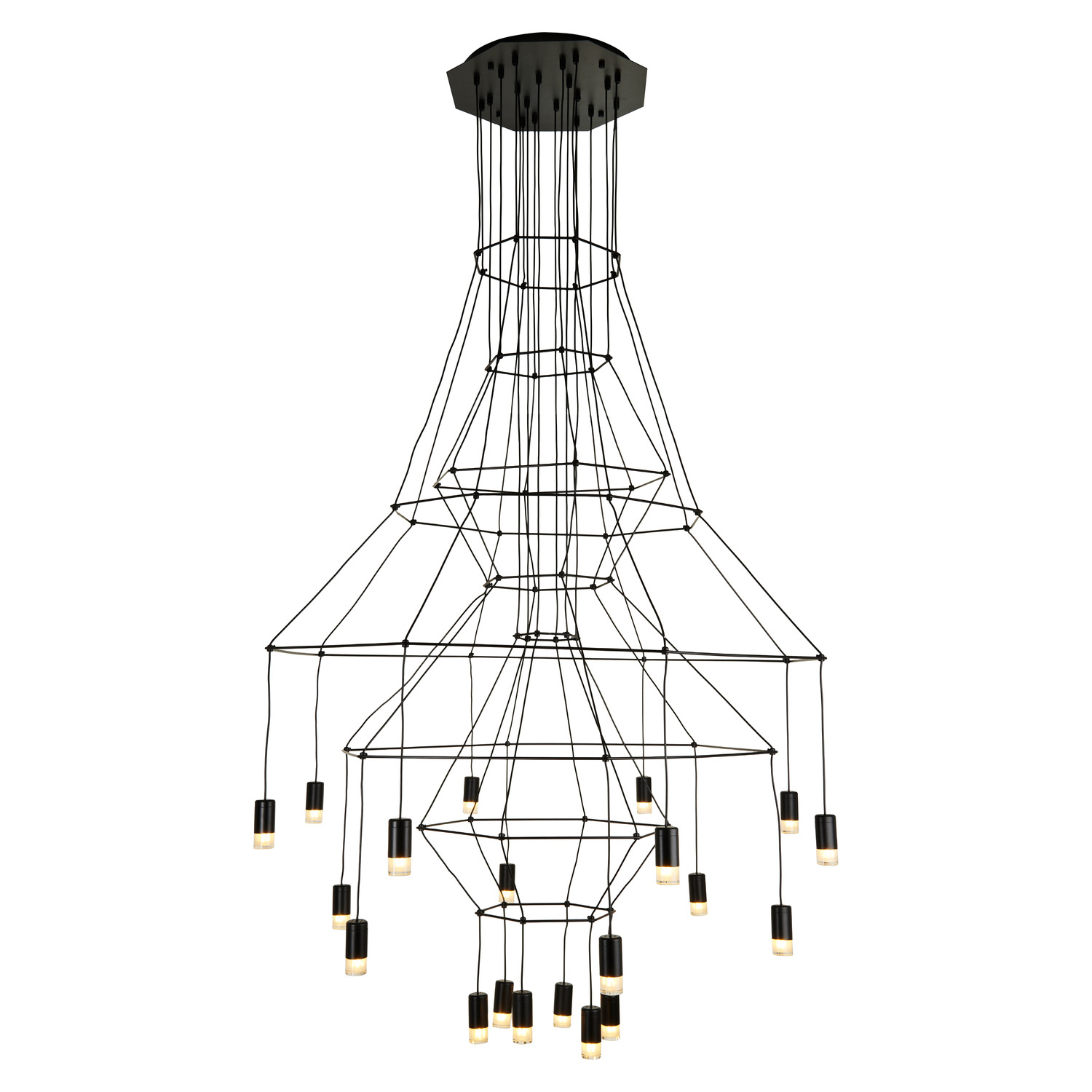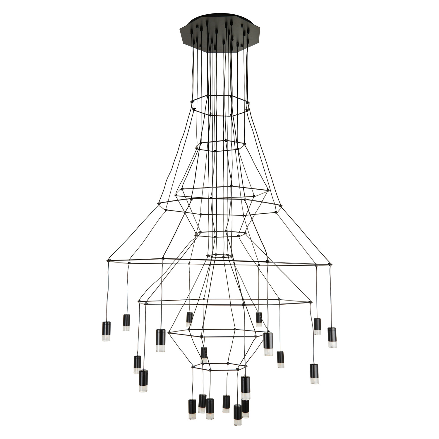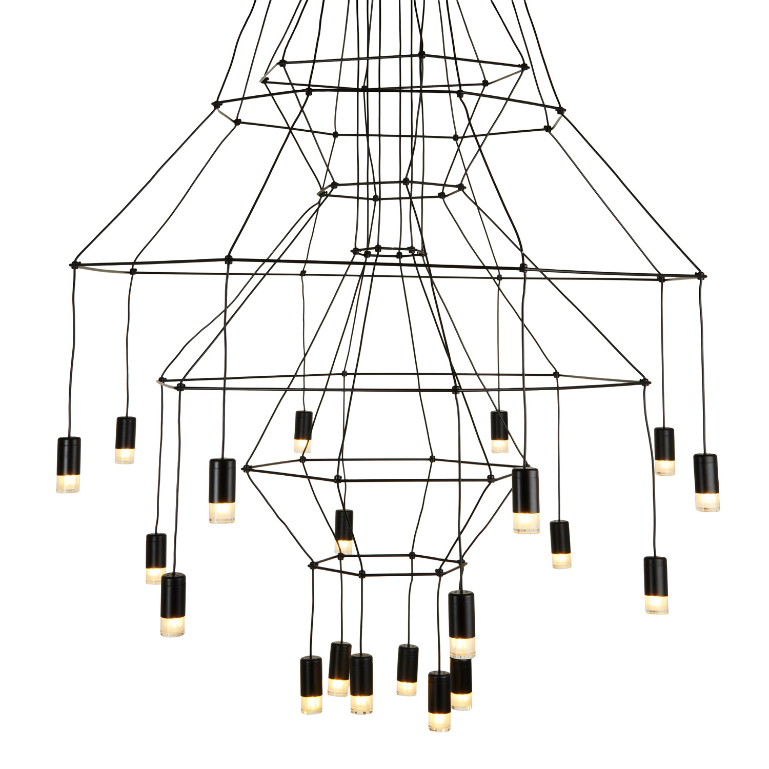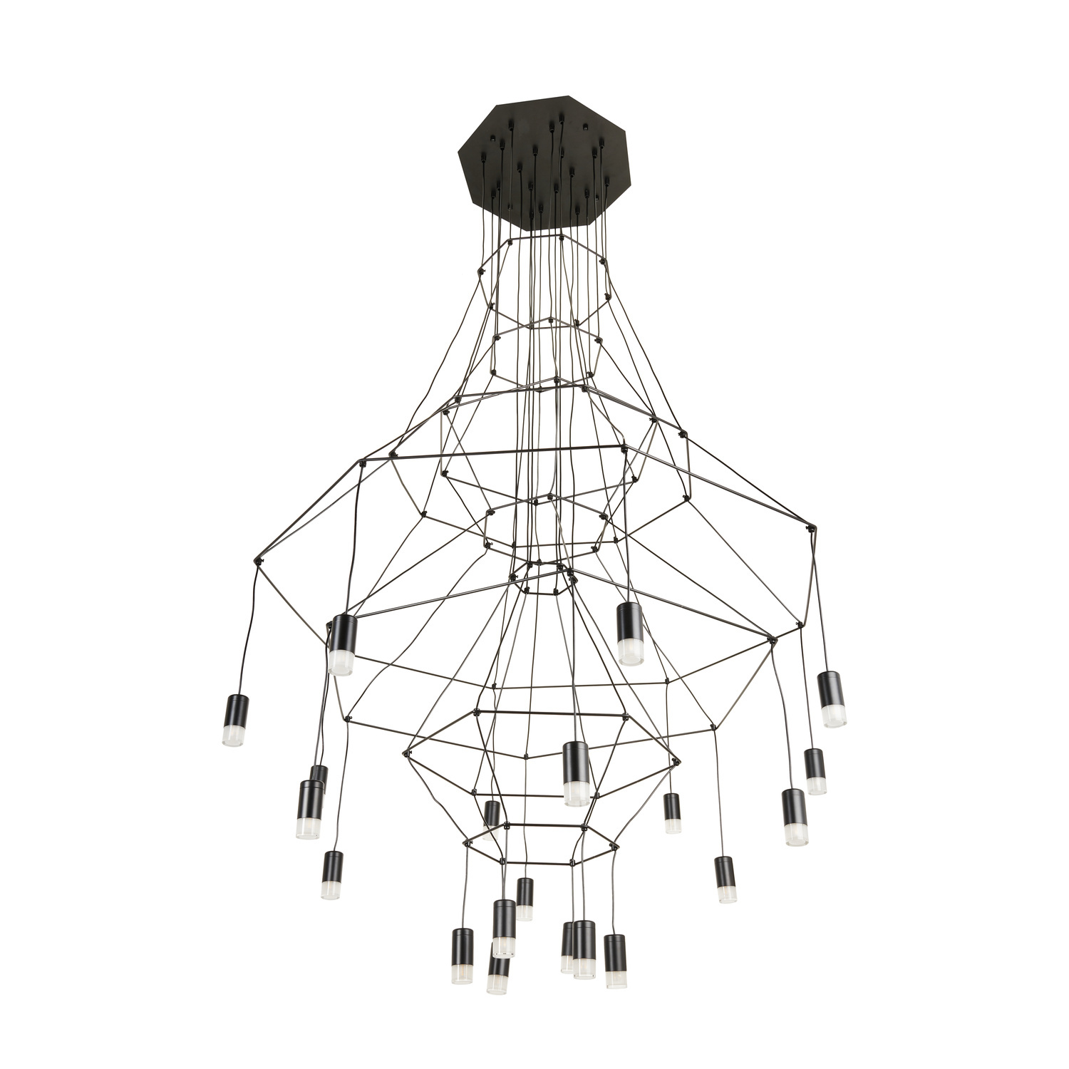 Nowoczesny żyrandol LINEA 20 to efektowna lampa wisząca o ażurowej, geometrycznej konstrukcji, idealna do wysokich wnętrz. Czarne, cienkie pręty tworzą wielopoziomową, przestrzenną formę, która nadaje lampie industrialny i minimalistyczny charakter.