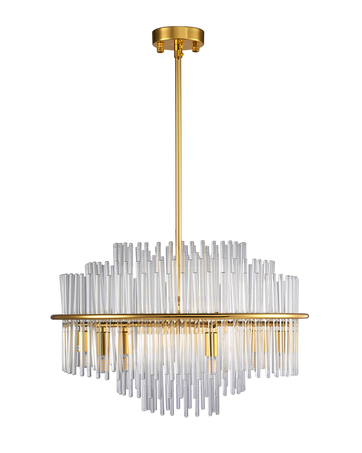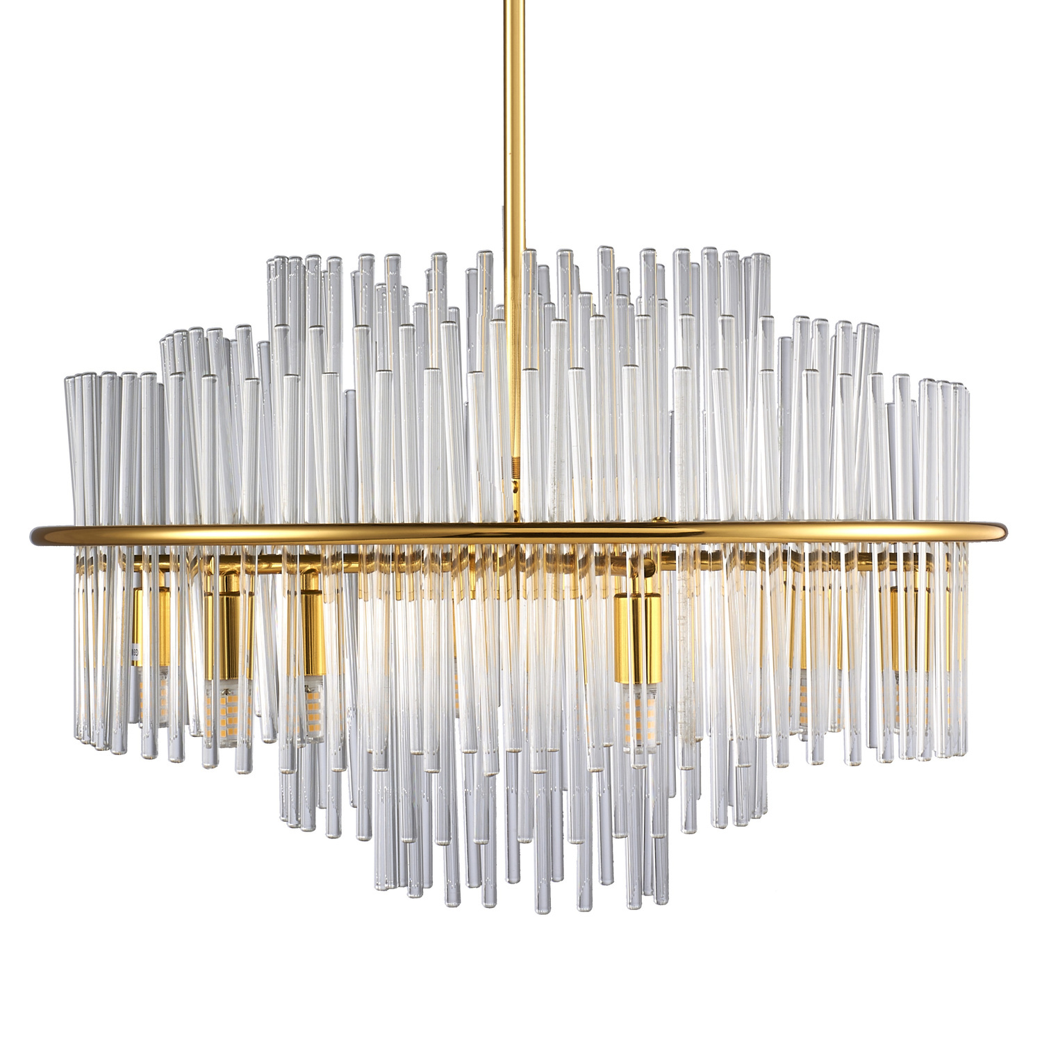 Złoty kolor dodaje ciepła i luksusu. Z centralnej ramy zwisają liczne, przezroczyste szklane rurki o różnej długości. Są one ułożone warstwowo, tworząc dynamiczną i bogatą formę, przypominającą kaskadę.