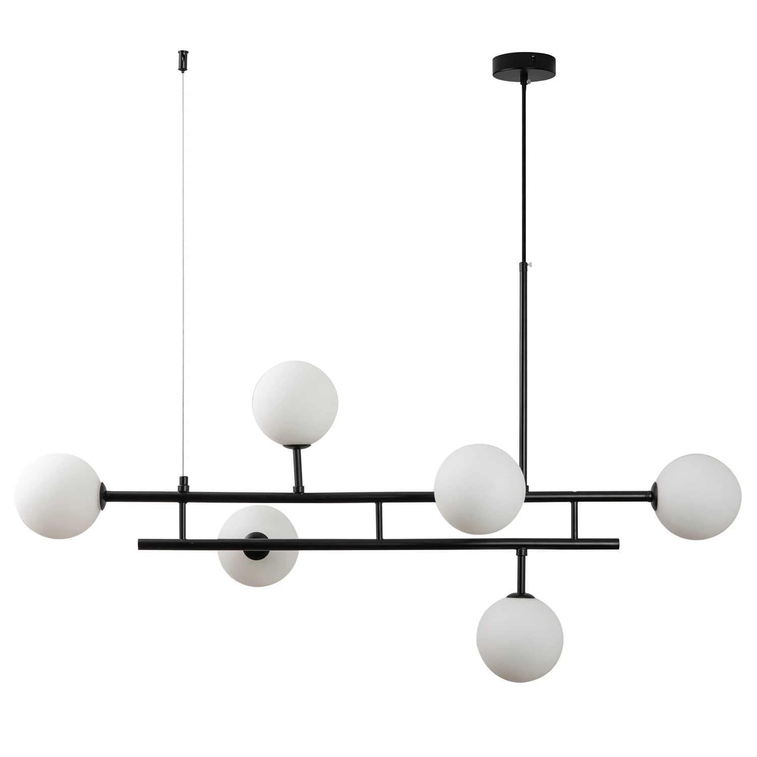 Minimalistyczna forma podwójnej listwy z dodatkiem sześciu szklanych kloszy.