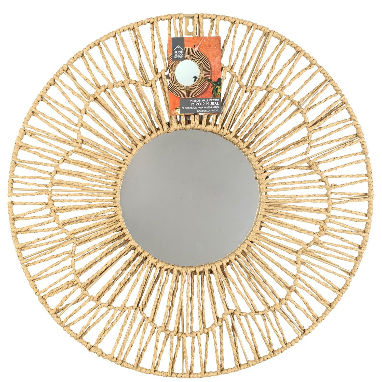 Lustro w stylu boho o średnicy 50cm wykonane zostało z metalowego szkieletu ozdobionego papierową plecionką. Średnica zwierciadła 20cm