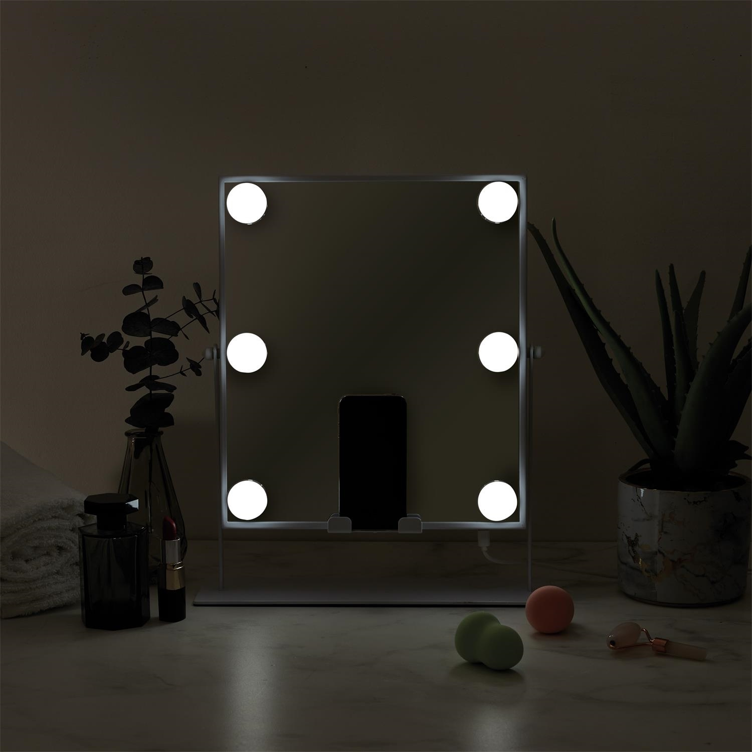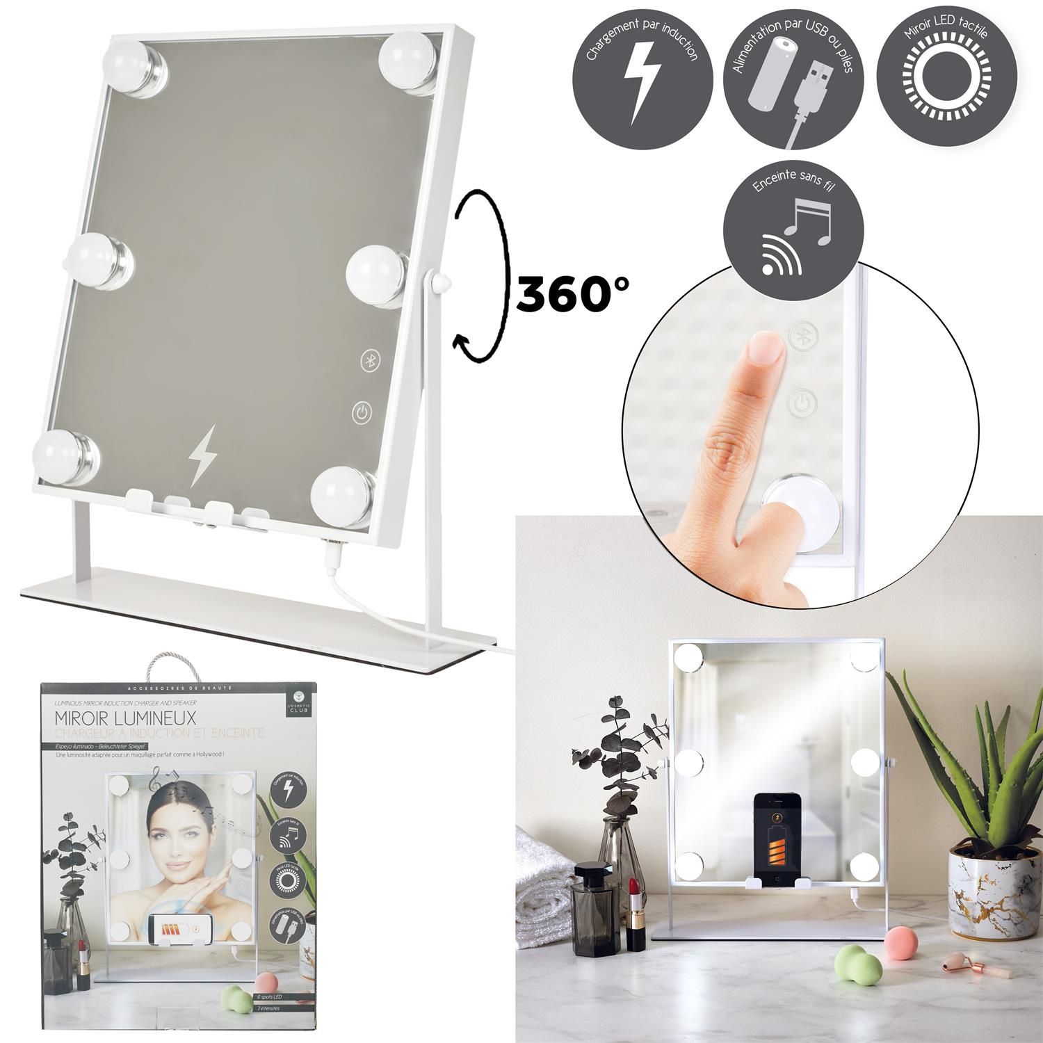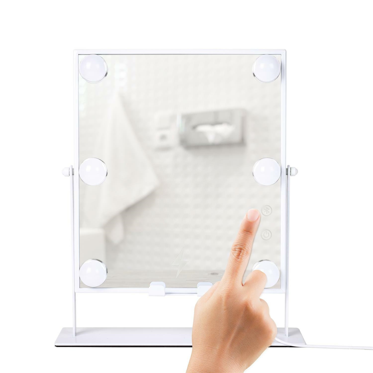 LED-owe lusterko o wszechstronnym zastosowaniu to must have każdem kobety, która lub wielofunkcyjne zastosowania oraz oszczędność miejsca. Lusterko posiada takie funkcje jak: -6 żarówek oświetlających twarz -ładowarka indykcyjna do telefonu -głośnik bluetooth kompatybilny z telefonem. Lustro zasilane jest za pomocą przewodu USB Zwierciadło lustra obraca się o 360 stopni, dzięki czemu możemy idealnie ustawić je do swoich preferencji podczas makijażu. Materiał: metal, szkłoCechy produktu
