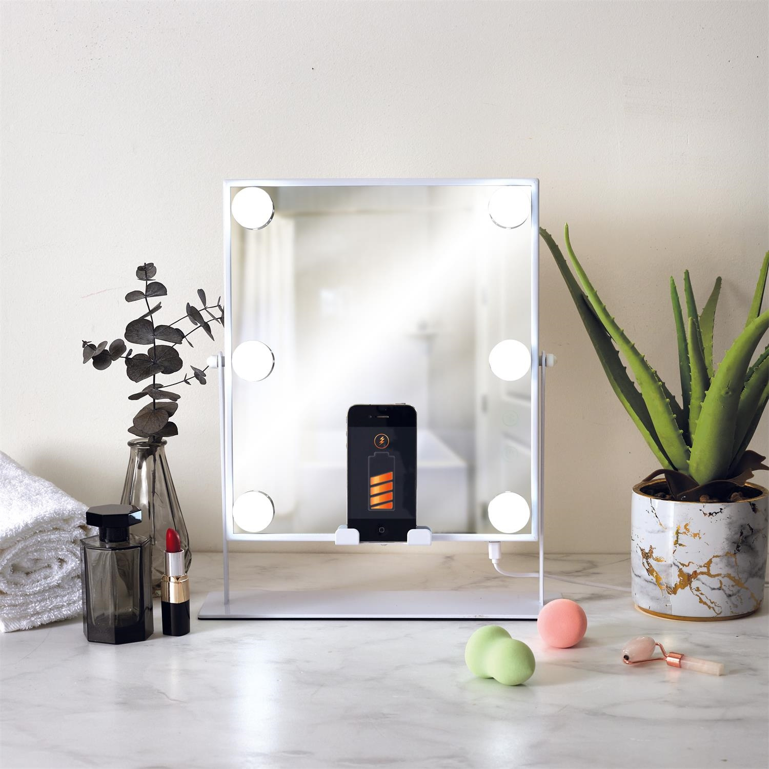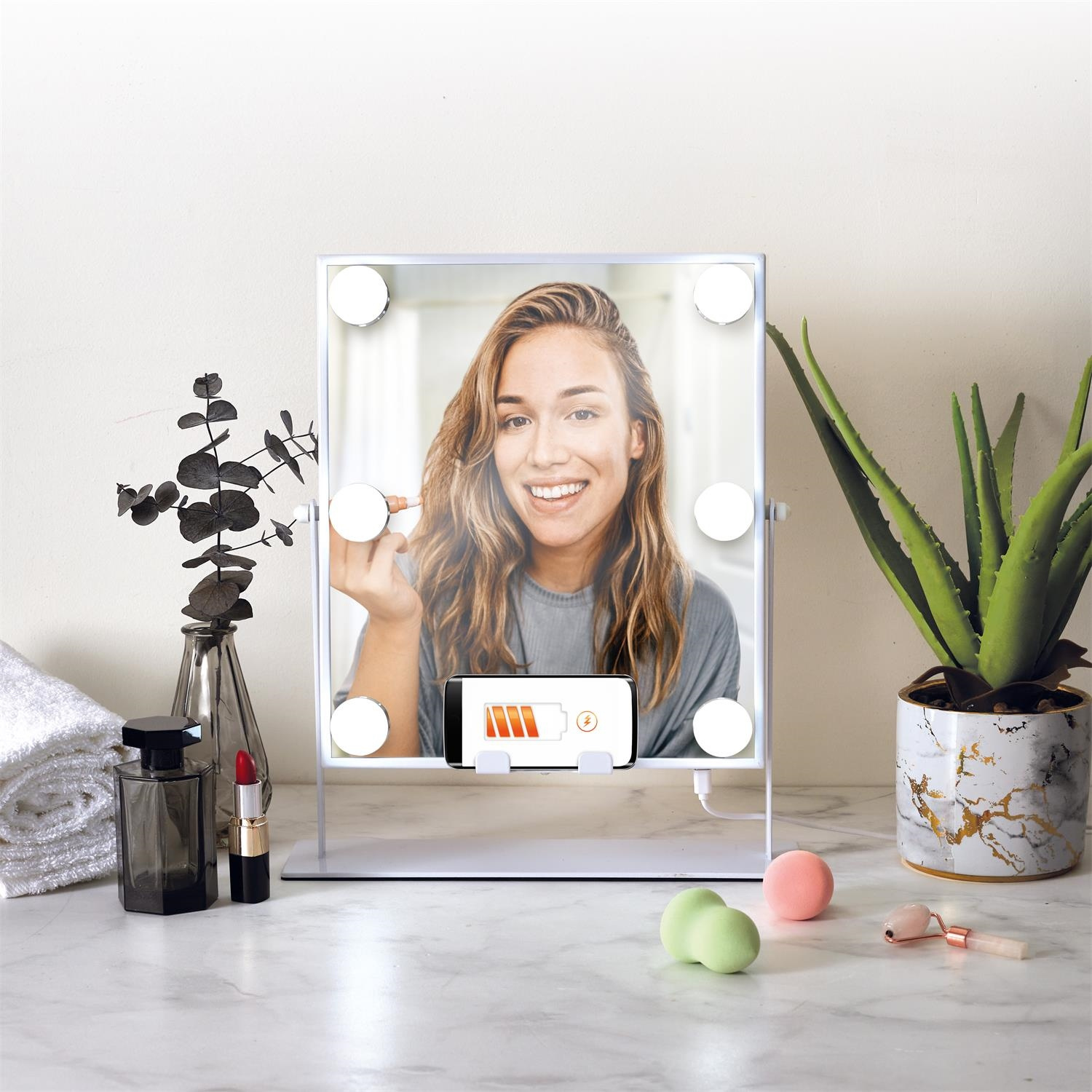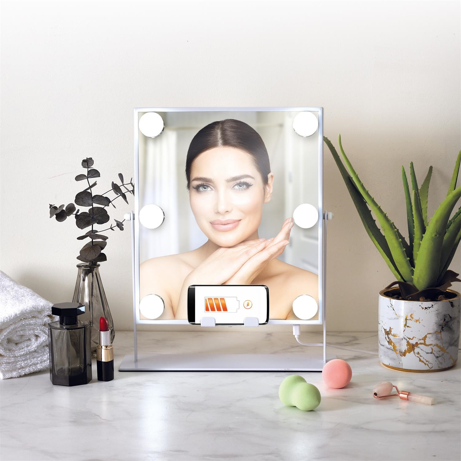 LED-owe lusterko o wszechstronnym zastosowaniu to must have każdem kobety, która lub wielofunkcyjne zastosowania oraz oszczędność miejsca. Lusterko posiada takie funkcje jak: -6 żarówek oświetlających twarz -ładowarka indykcyjna do telefonu -głośnik bluetooth kompatybilny z telefonem. Lustro zasilane jest za pomocą przewodu USB Zwierciadło lustra obraca się o 360 stopni, dzięki czemu możemy idealnie ustawić je do swoich preferencji podczas makijażu. Materiał: metal, szkłoCechy produktu