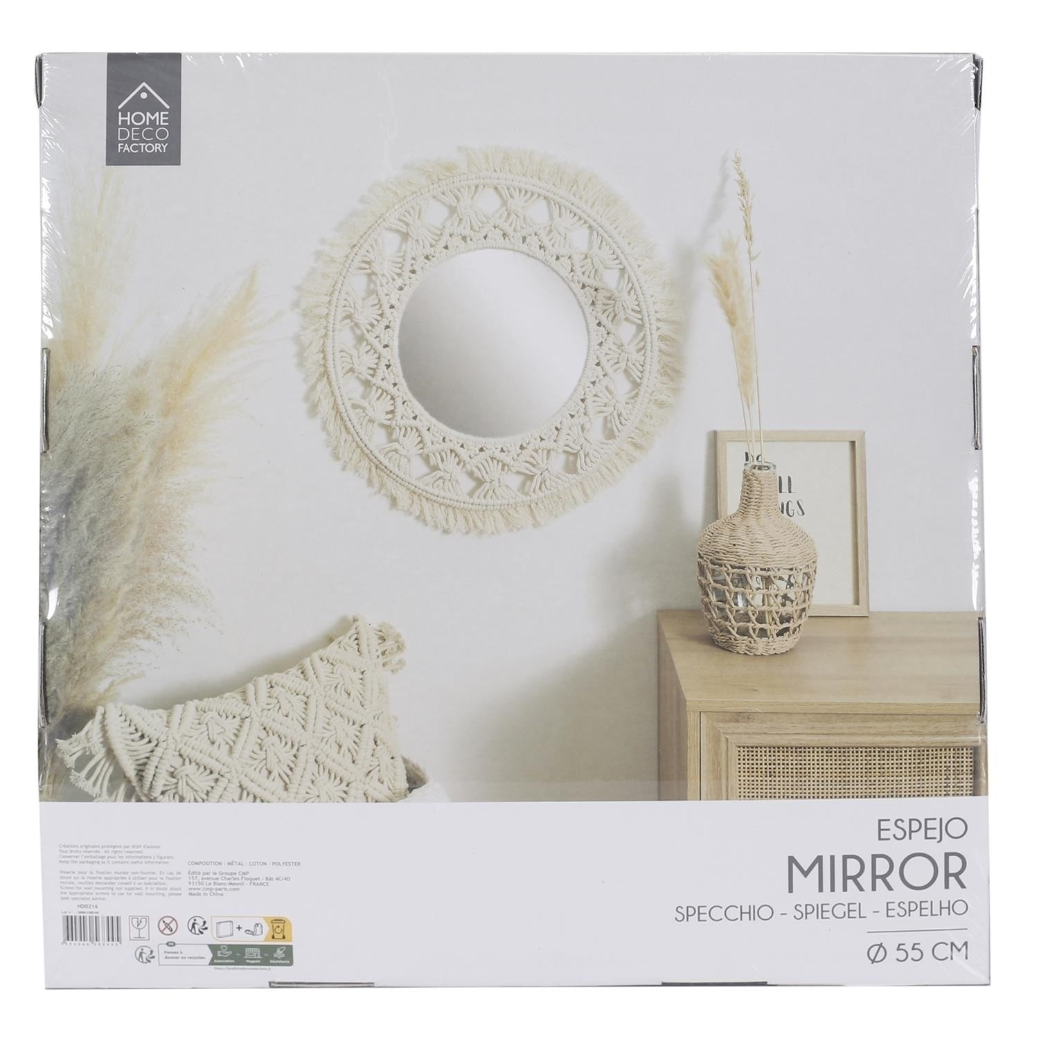 Lustro z plecioną ramą to idealny dodatek do wnętrza boho. Okrągłe lustro ozdobione zostało bawełnianymi zaplecionymi sznurkami. Beżowy odceń ramy dodaje całości delikatny i subtelny wygląd. Lustro posiada dziurkę do zawieszenia na ścianie. Brak zestawu montażowego w zestawie Wymiary kartonu: 47x18x47,55cm. Max. 6 szt w kartonieCechy produktu