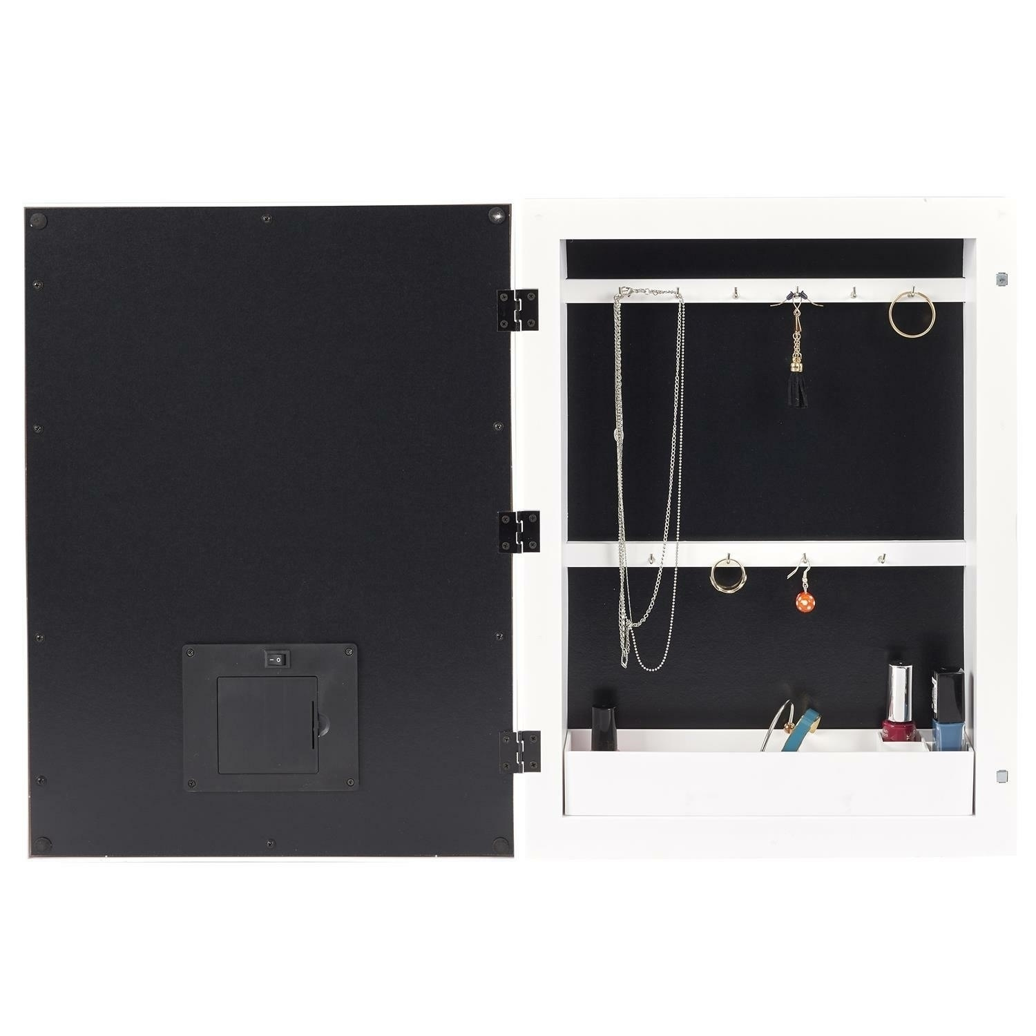 Szafka z lustrem i oświetleniem LED to idealny mebel do łazienki lub przedpokoju. Otwierana szafka o głębokości 9 cm, pomieści klucze, spinki lub kosmetyki. Dziesięć haczyków oraz głęboka półka pozwolą na utrzymanie porządku. Każdy przedmiot będzie miał swoje miejsce. Szafka z wytrzymałego, białego tworzywa pozwoli na utrzymanie porządku w najmniejszej łazience. Oświetlenie LED, zasilane jest na baterie (niedołączone do zestawu).